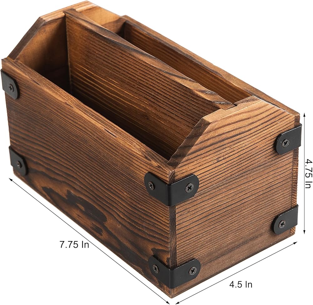 The rustic torched wood tabletop remote control holder exudes a vintage charm with its elegant wood finish and black metal wrap accents. This stylish caddy not only keeps your remotes organized but also adds a touch of sophistication to any room decor, seamlessly fitting into both modern and traditional settings. Crafted from solid wood, this holder promises strength and durability.