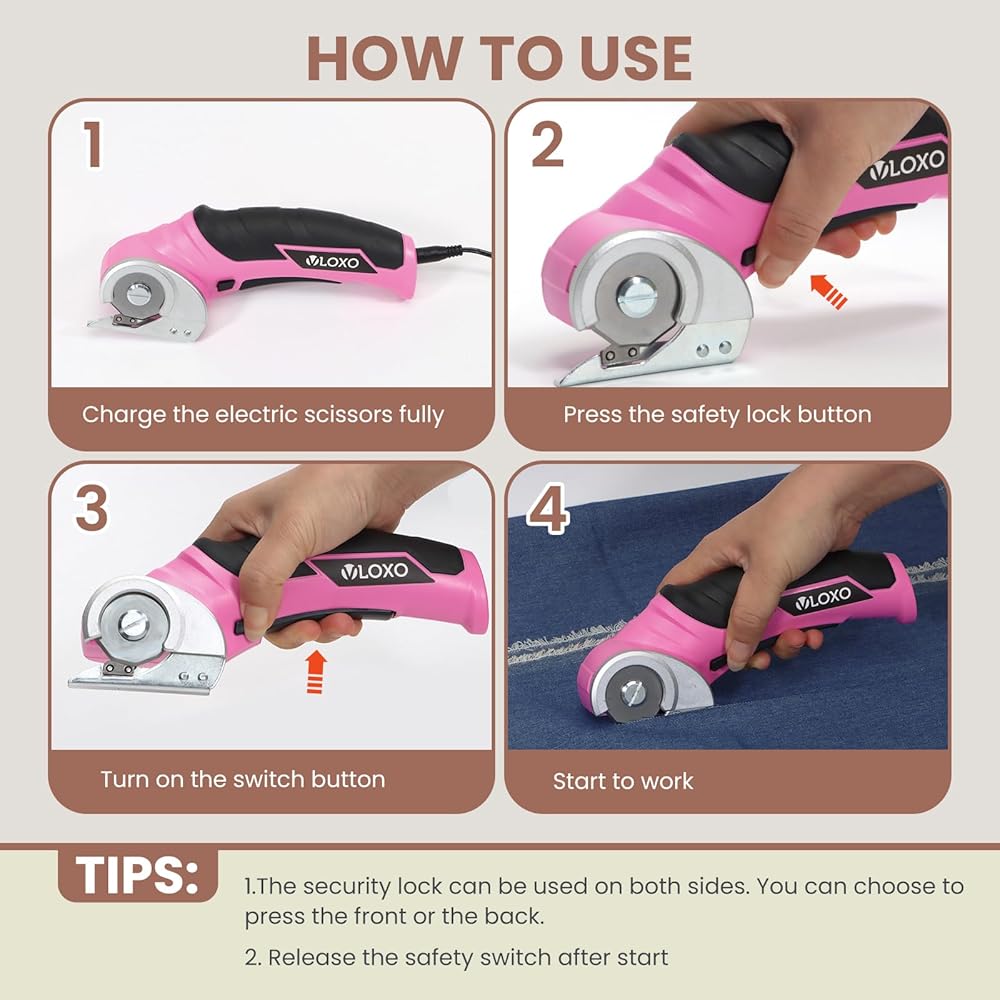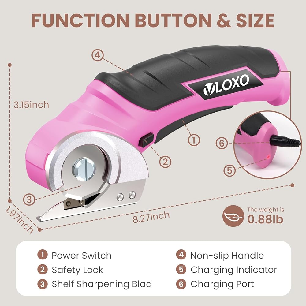 Efficient and Powerful Electric Scissors: VLOXO cordless electric scissors are built with a 2000mAh battery capacity, which can last 40 minutes. When you use it, you will feel its wind-like cutting speed. At the same time, plug-in charging greatly improves the charging speed. It can cut canvas, leather, cardboard boxes, and other slightly hard materials. TIP: Not for fabric and precision cutting.