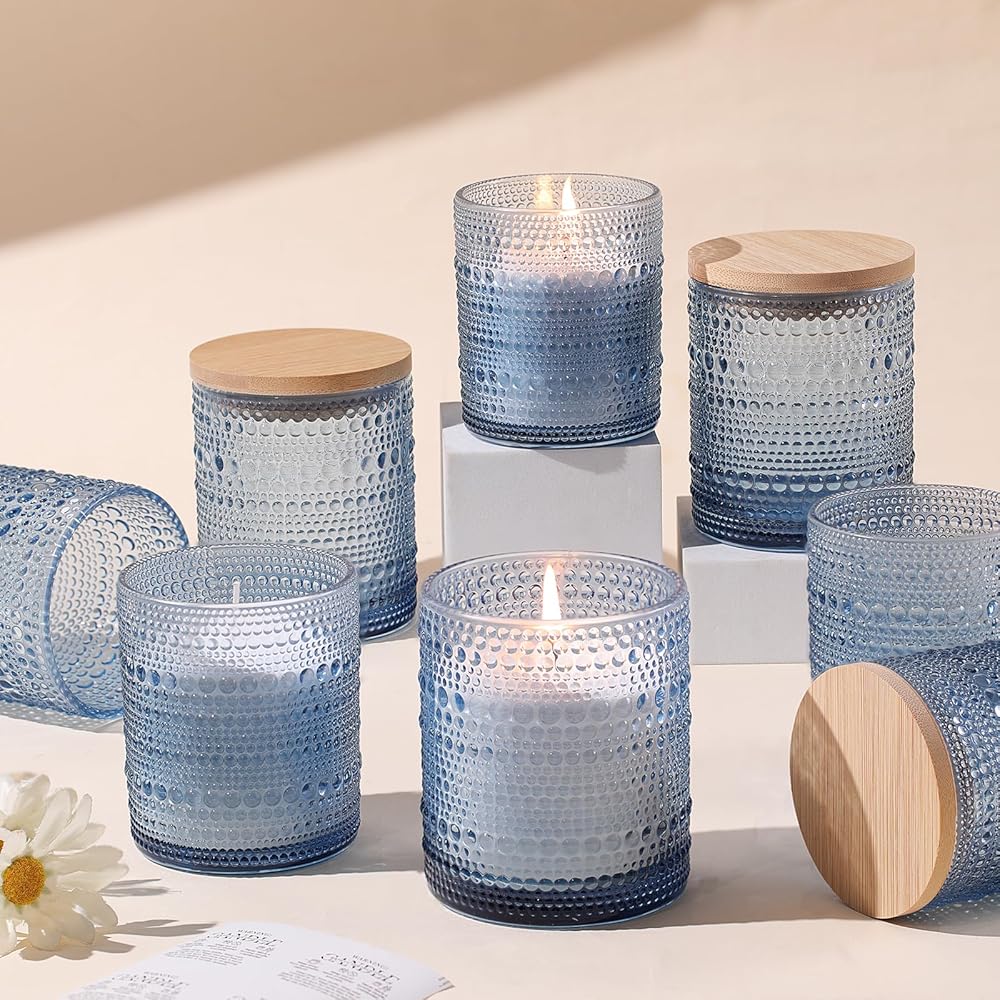 DEVI Assorted Blue Glass Candle Jars for Making Candles (8 Pack),8 oz & 14 oz Candle Jars with Bamboo Lids & Labels, Bulk Empty Storage Containers, Candle Tins Making Supplies, Blue Table Decor