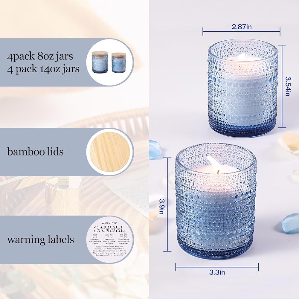 Size and Capacity: 14 oz: 3.3" (Out Diameter) x 3.9" (Height) glass round candle jars. Net Capacity:14 oz: 8 oz: 2.87" (Out Diameter) x 3.54" (Height). One pack includes 4 tins 8oz and 4 tins 14oz candle jars. The candle jars are heat-resistant, strong, hard to break, and reusable.
