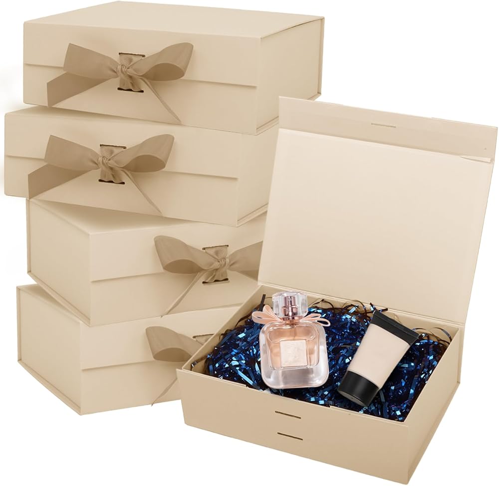 Nsmykhg Magnetic Gift Boxes with Lids & Decoration Tie Ribbon, 5 Pack 9.5x7x4 Inch, for Birthday, Wedding, Groomsman & Bridesmaid Proposal, Luxury Elegant Gift Box with Magnetic Closure (Beige)