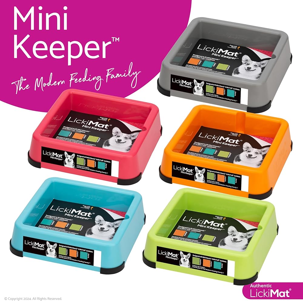 LickiMat Mini Keeper can be used with any LickiMat Mini Classic and LickiMat TUFF Mini Classic (as well at LickiMat Catster). Easy to use: simply put the LickiMat into the Keeper. There is a patent pending notch to make it easier to remove the LickiMat (hard for your dog to use). You can wet the bottom of the Classic LickiMat when inserting into the LickiMat Keeper for greater adhesion. Fill LickiMat first, and optionally add food on top. 100% Dishwasher Safe.