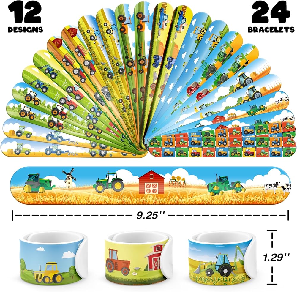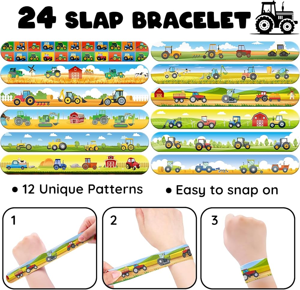 🎨 【24 FUN SLAP BRACELETS】 Each bracelet features a vibrant, playful tractor design – 12 unique patterns to match every party vibe! They snap right on your wrist with a fun “slap” and are perfect for both play and style. They are sure to bring joy to kids (and adults!) of all ages.