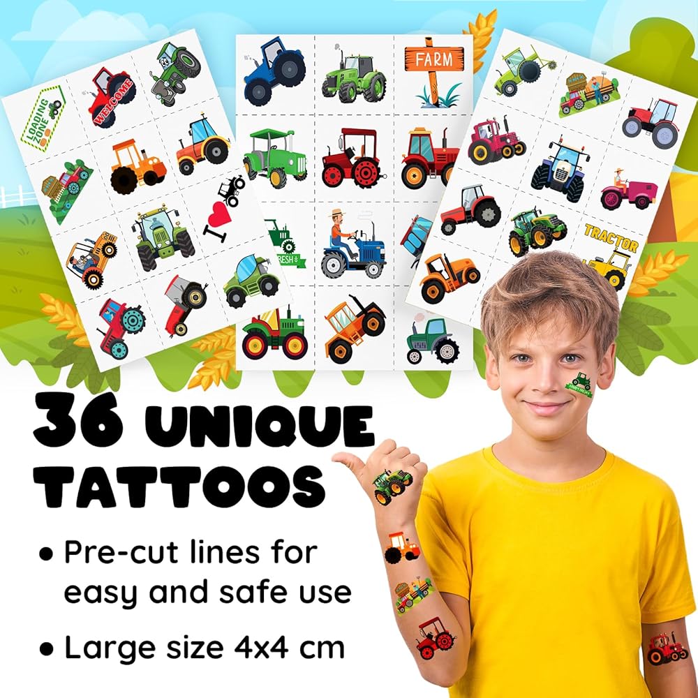 🌟 【36 PRE-CUT TEMPORARY TATTOOS】 Why stop at bracelets? Our tractor tattoos are here to complete the look! Just Peel → Press → Party! Tattoos last 2 days but vanish instantly – Perfect for school rules!