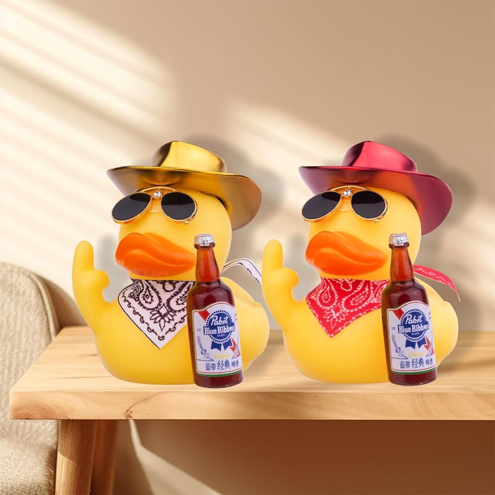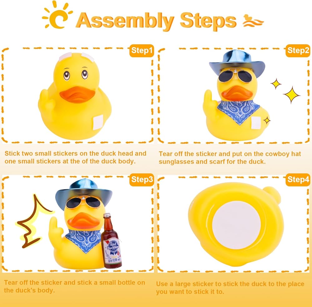 ✨ DIY Fun: This duck decoration needs to be assembled. Put on a scarf and sunglasses, secure the hat and bottle with small double-sided tape, and then stick the duck where you want it to be placed. If you have any questions, please don't hesitate to contact us.