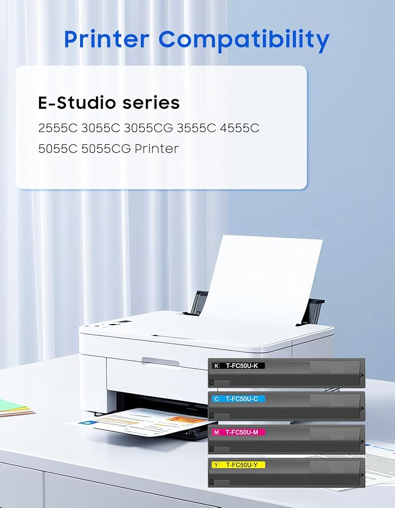 What's in the box: 1 x T-FC50U-K Black , 1 x T-FC50U-C Cyan, 1 x T-FC50U-M Magenta, 1 x T-FC50U-Y Yellow, total 4 Compatible T-FC50U TFC50U Toner Cartridges