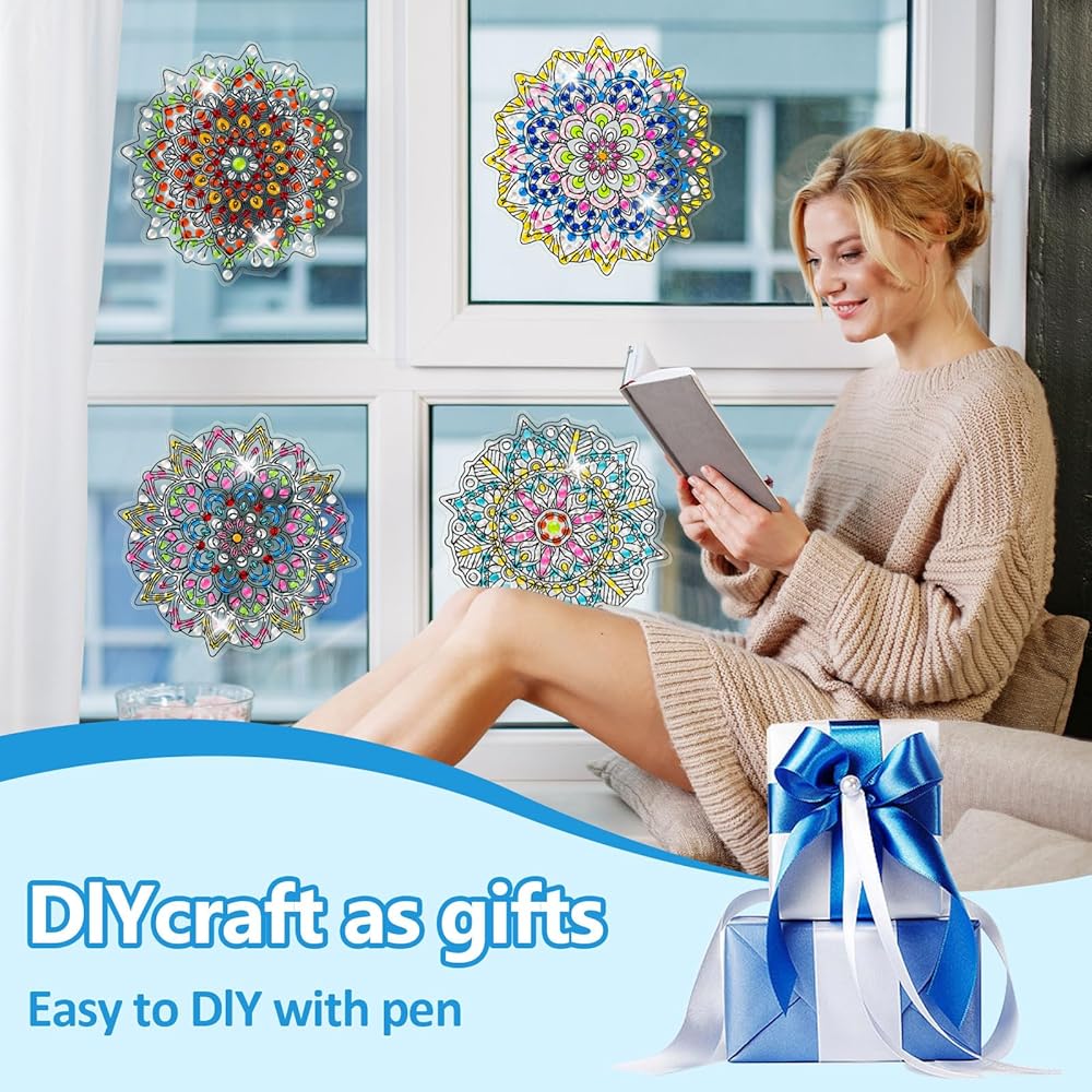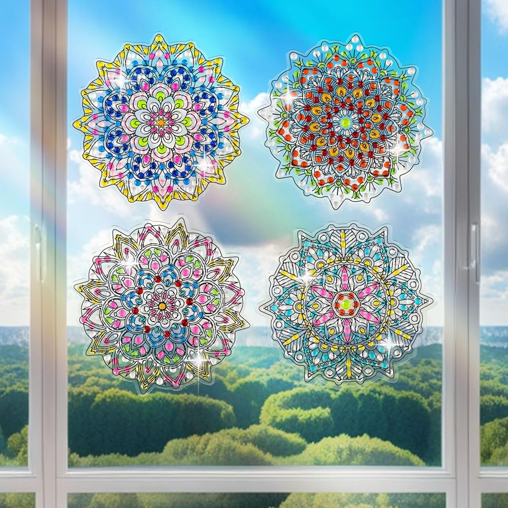 LINGFANG 4 Pcs Diamond Art Stained Glass Window Clings with Diamond DIY Pen Tools, Diamond Painting Window Stickers for Suncatchers, Diamond Art Kits for Adults, Diamond Art Accessories (Mandala 4)