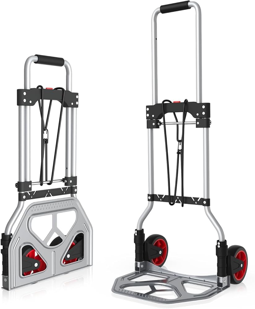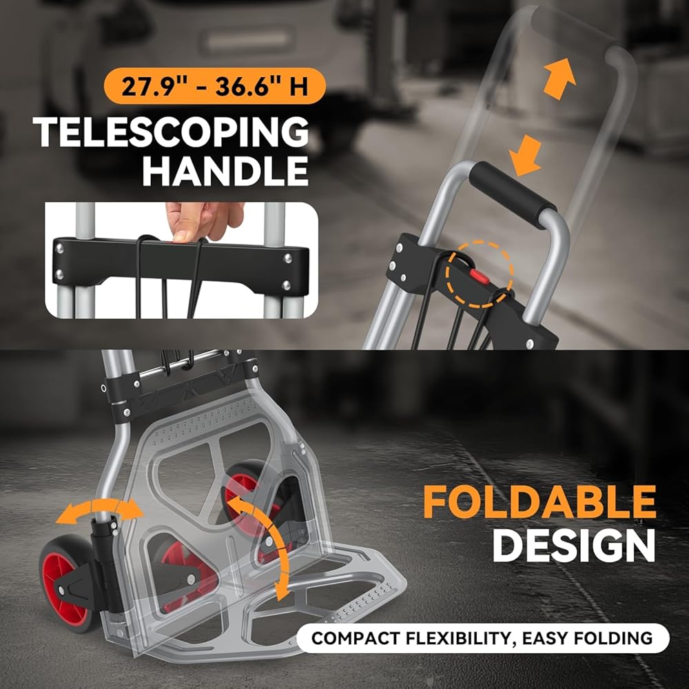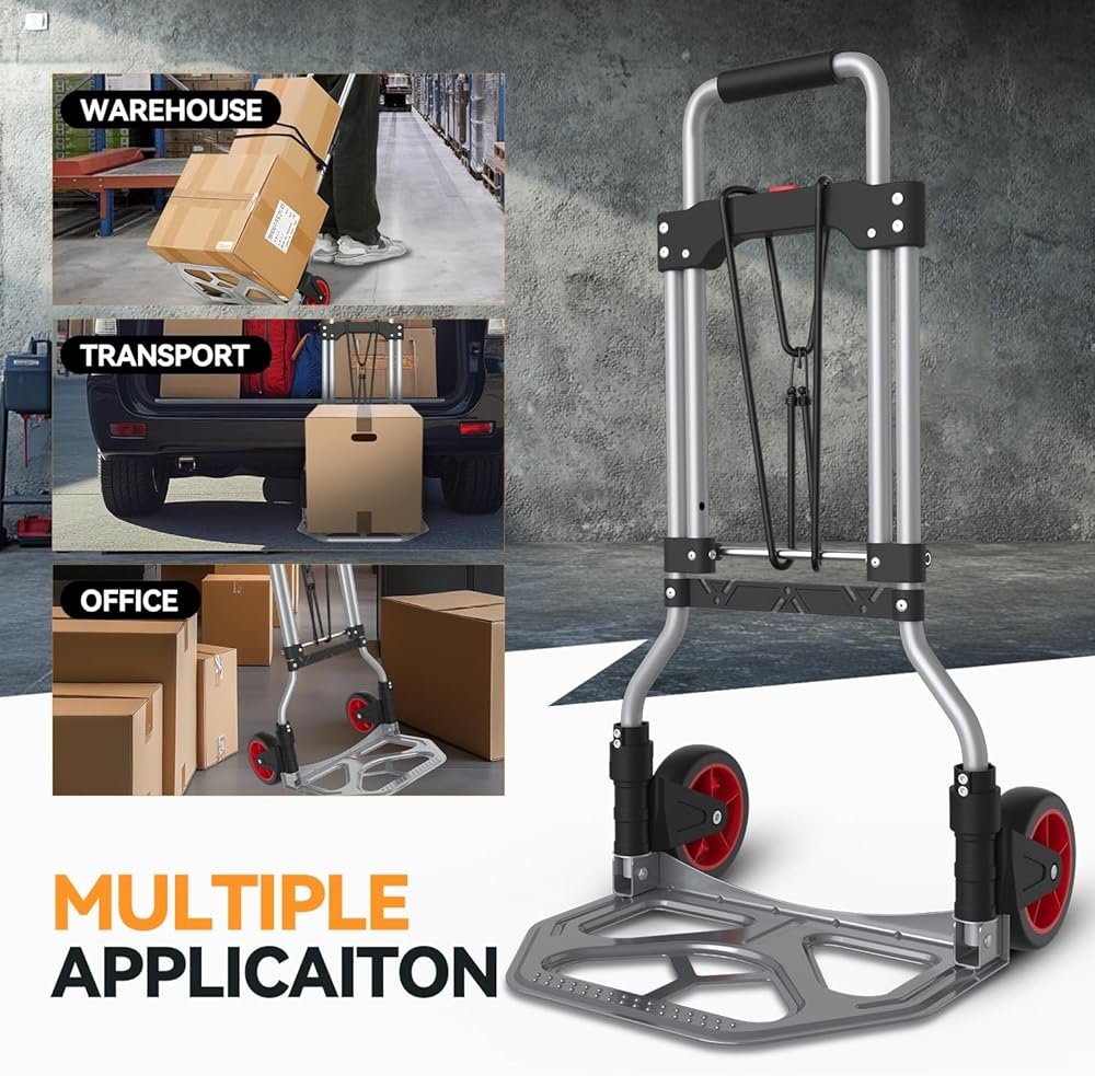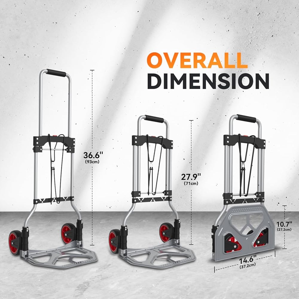 【Impressive Load Capacity】Boasting an exceptional load-bearing capacity of up to 220lbs, this foldable hand truck effortlessly meets your daily transportation needs. Its clever folding design minimizes space occupation when not in use.