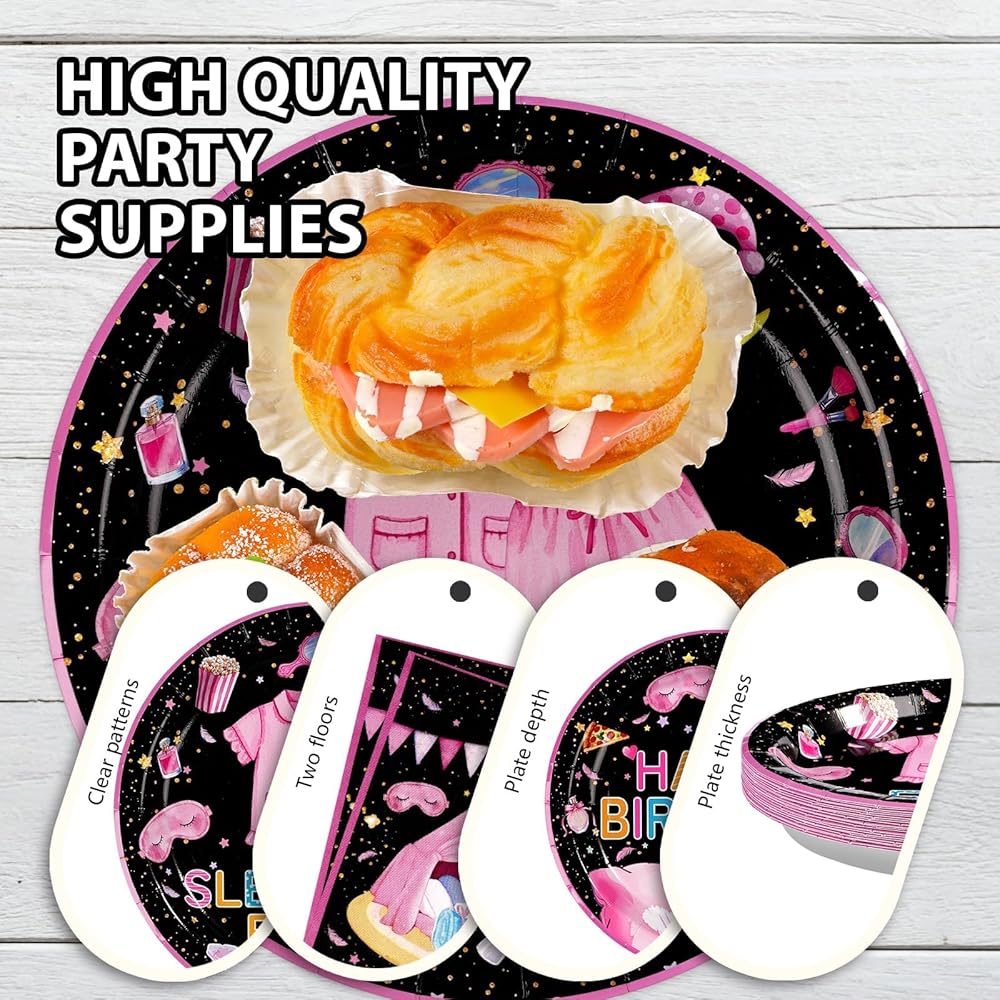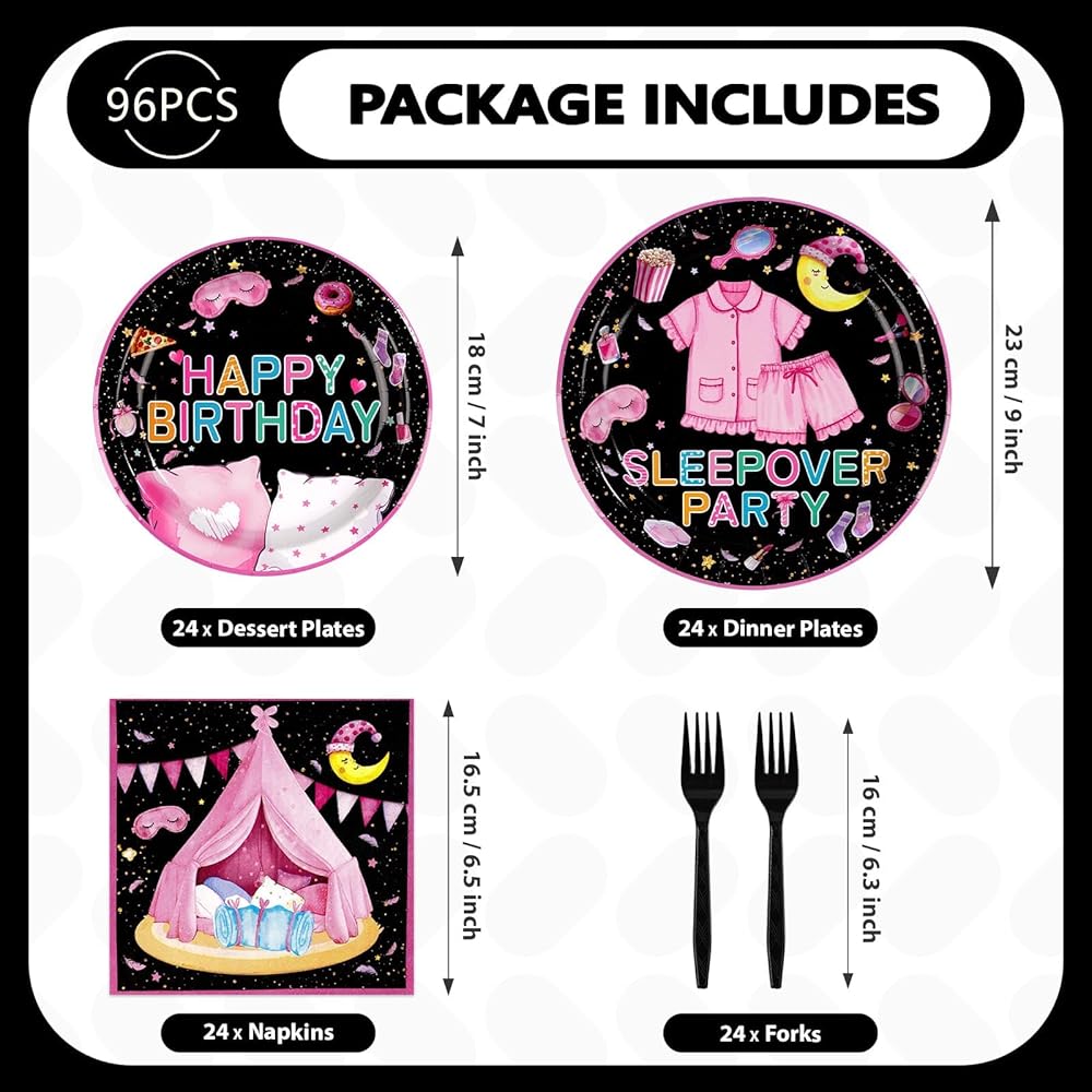 96PCS Serve 24 Guests: Pajama birthday decorations disposable tableware set includes 24 dinner plates (9 inches), 24 dessert plates (7 inches), 24 napkins, and 24 forks. Perfect for girls sleepover party supplies