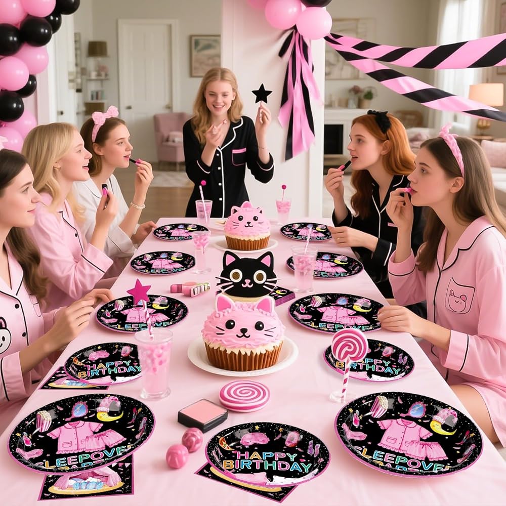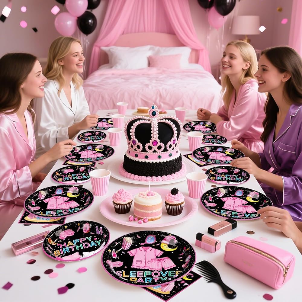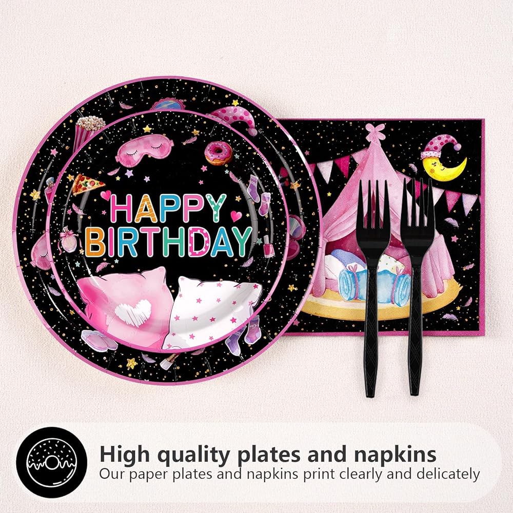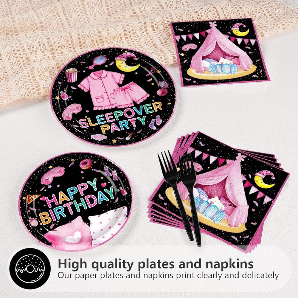 Grencian 96 Pcs Sleepover Birthday Party Supplies Black Sleepover Plates and Napkins Disposable Tableware Set Pajama Party Decorations for Girls Slumber Themed Birthday Decorations Serves 24