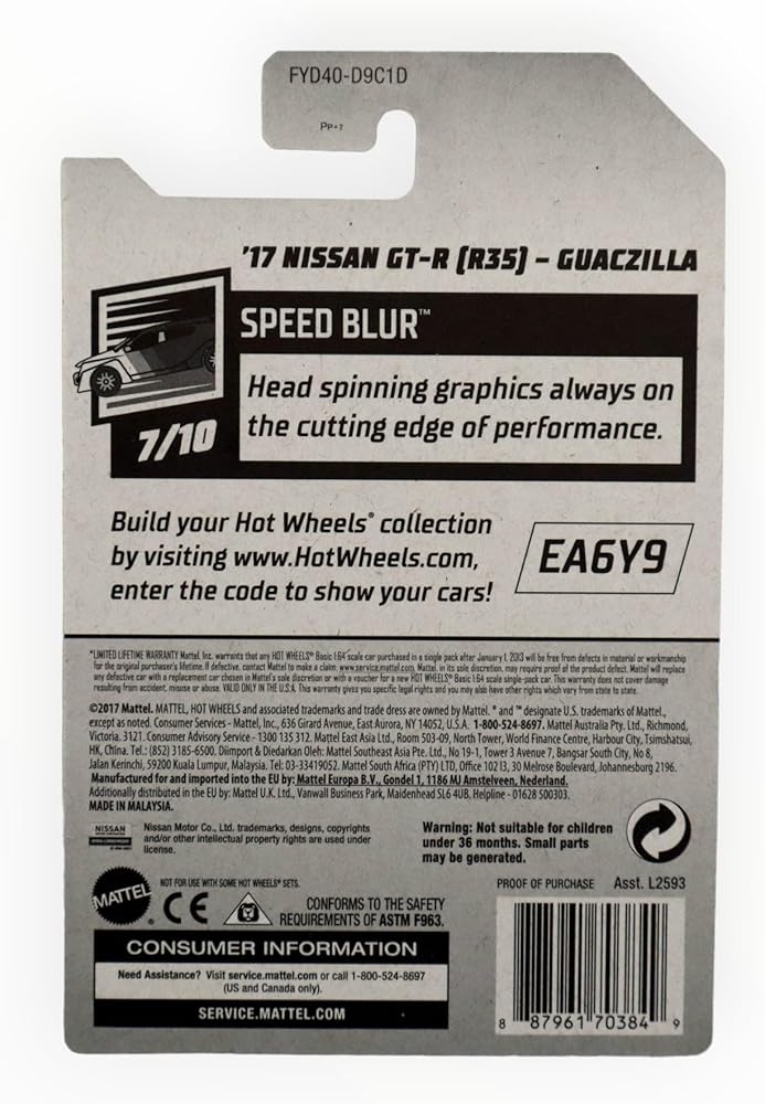 Hot Wheels 2019 Speed Blur T Fox '17 Nissan GT-R (R35) Guaczilla 61/250, Green, on a Standard "TFox" Card. Hot Wheels 1:64 Scale Die-Cast Metal collectible. Whether you are a collector or love playing with them, Hot Wheels is a brand that brings out the kid in all of us. Collect all your favorites. Recommended for ages 3+.