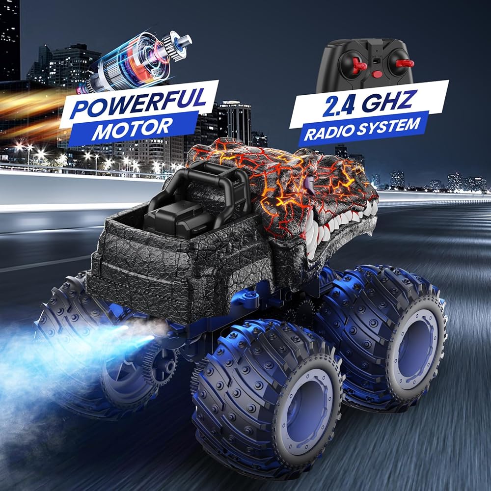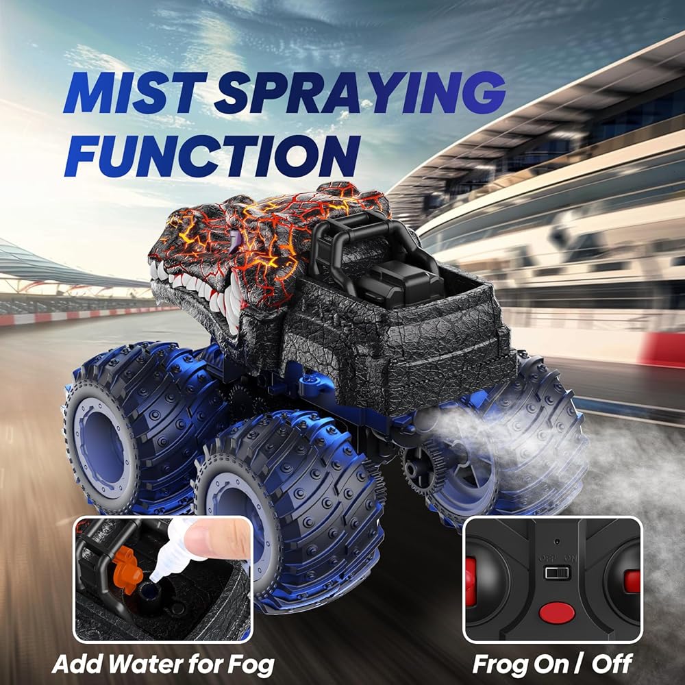 Light Effects and Cool Spray - The RC cars feature a unique spray function that resembles rocket boosters and captivating LED lights, offers more fun, and can be played indoors and outdoors at night. The distinctive black bull monster appearance attracts the attention of kids boys girls 3-5, 4-7, 8-12 years old. This monster truck is designed to be easy to operate, and children can enjoy the real fun of racing games.