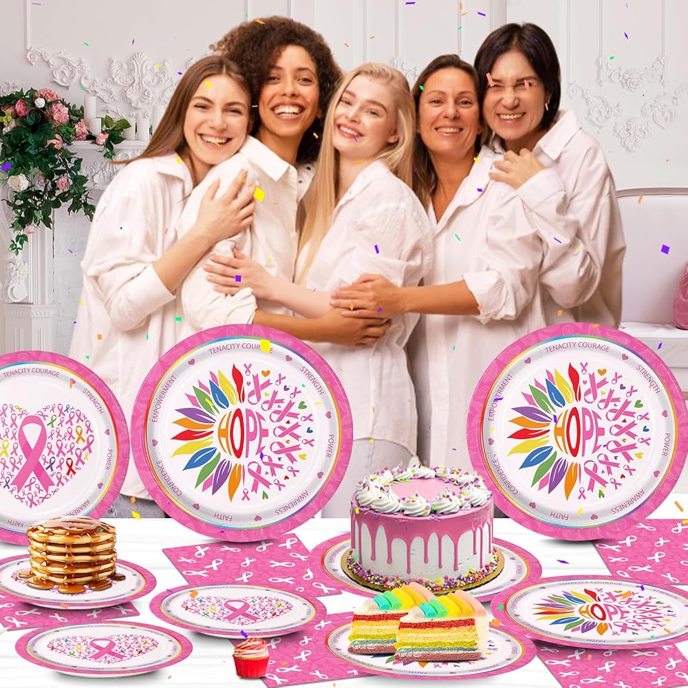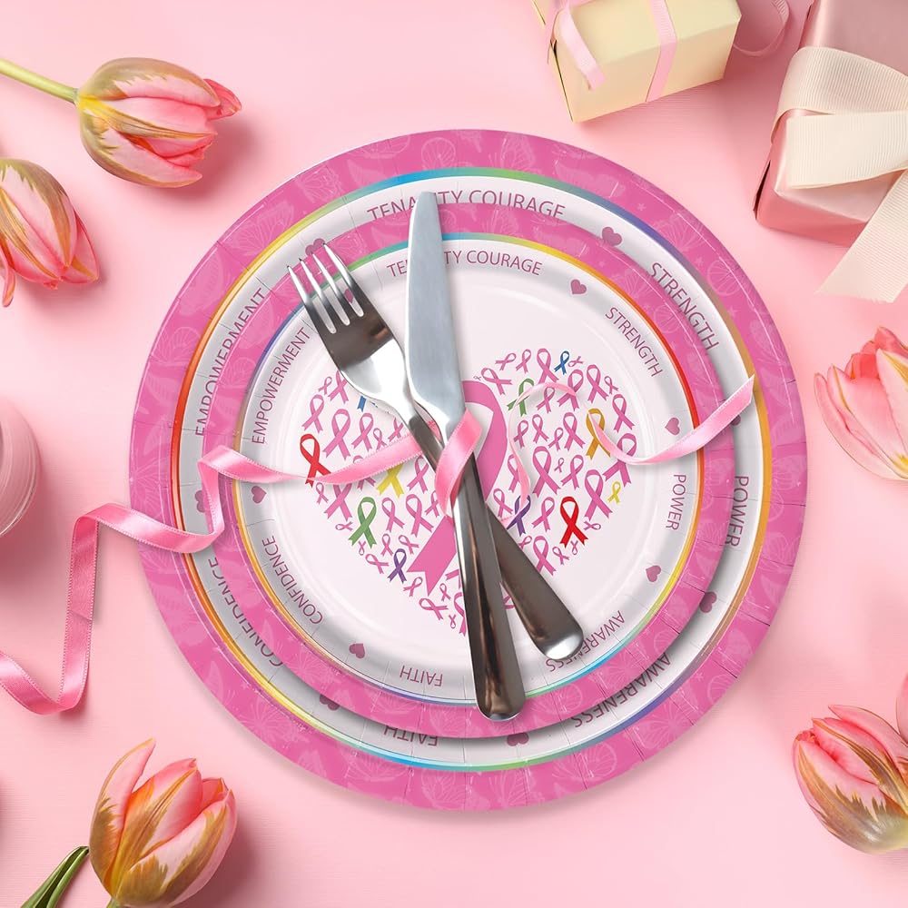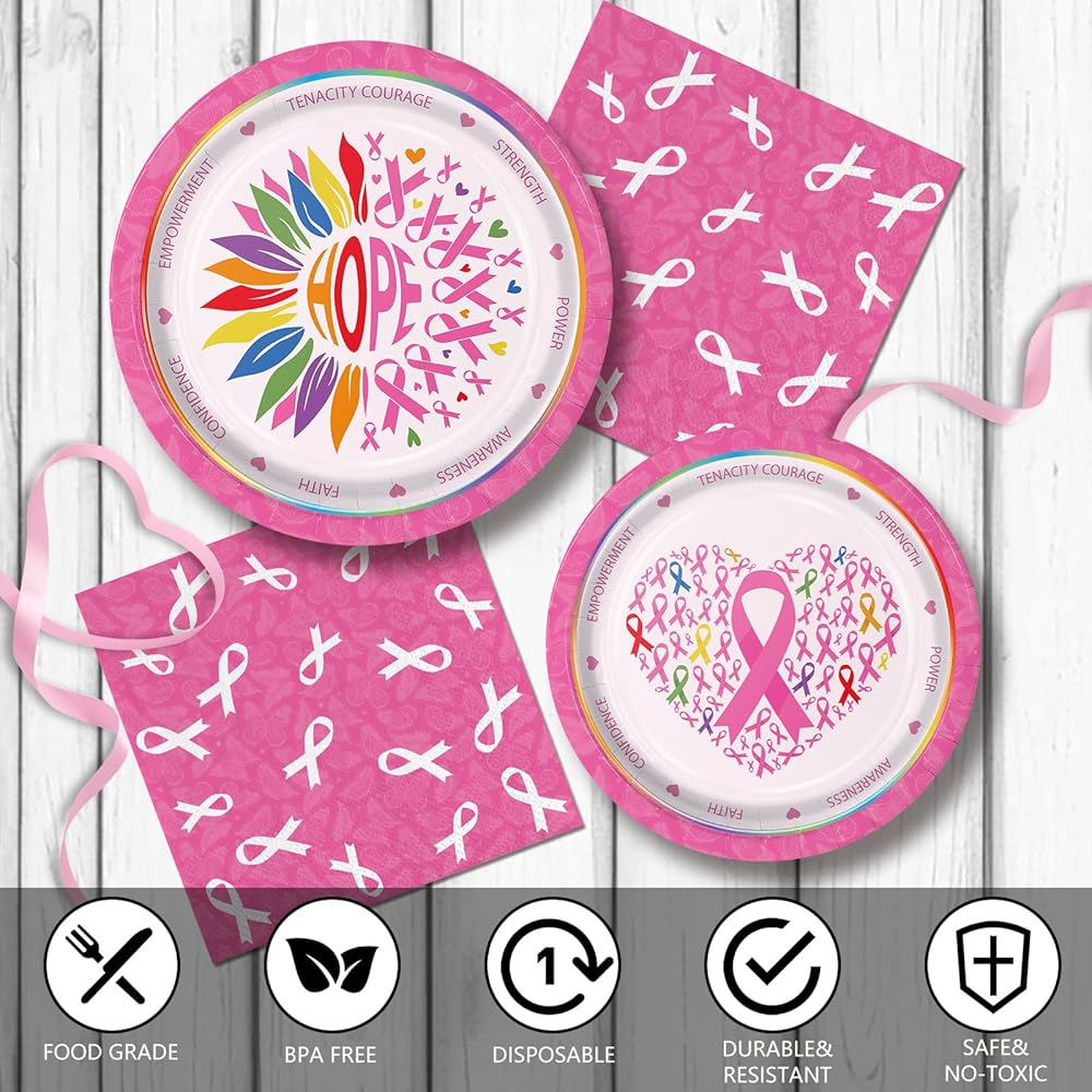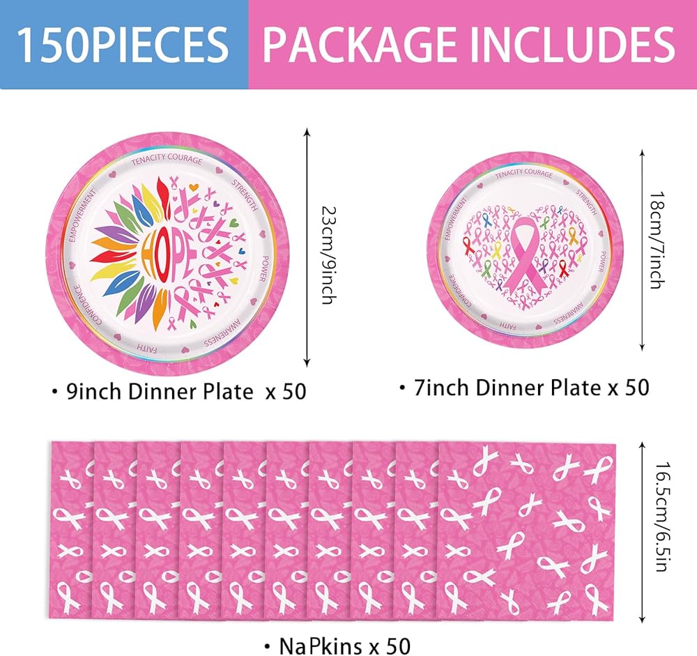 150pcs Breast Cancer Awareness Party Supplies Pink Ribbon Plates Napkins Disposable Dinner Plates Tableware Set Decorations for Breast Cancer Awareness Women Charity Activities Serve 50