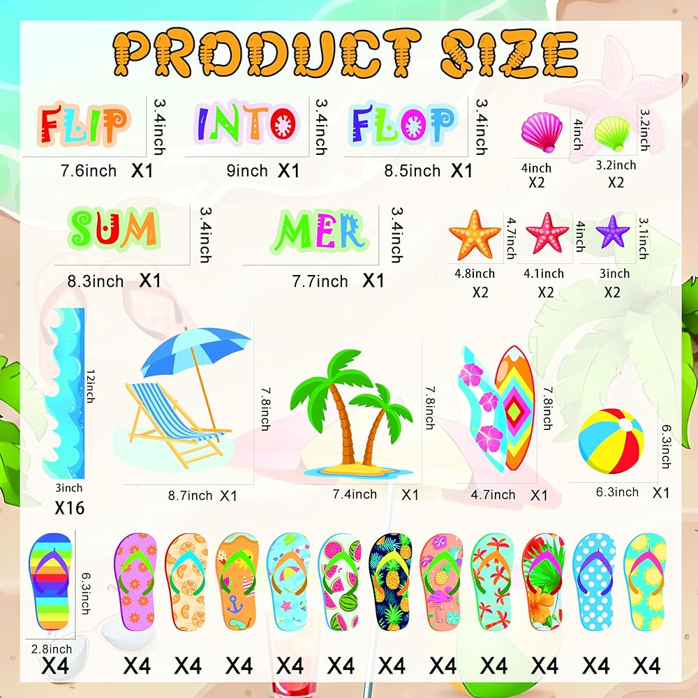 🏖🏖【Distinctive Design】 These flip flops cutouts decoration set are designed with funny summer patterns - such as flip flops, sea star, beach ball, shell, coconut tree, lounge chair, sunshade and the words "FLIP FLOP INTO SUMMER", cute patterns and printed with vibrant colors, full of summer vitality. It's ideal for decorating classroom bulletin boards, chalkboards, or offices.