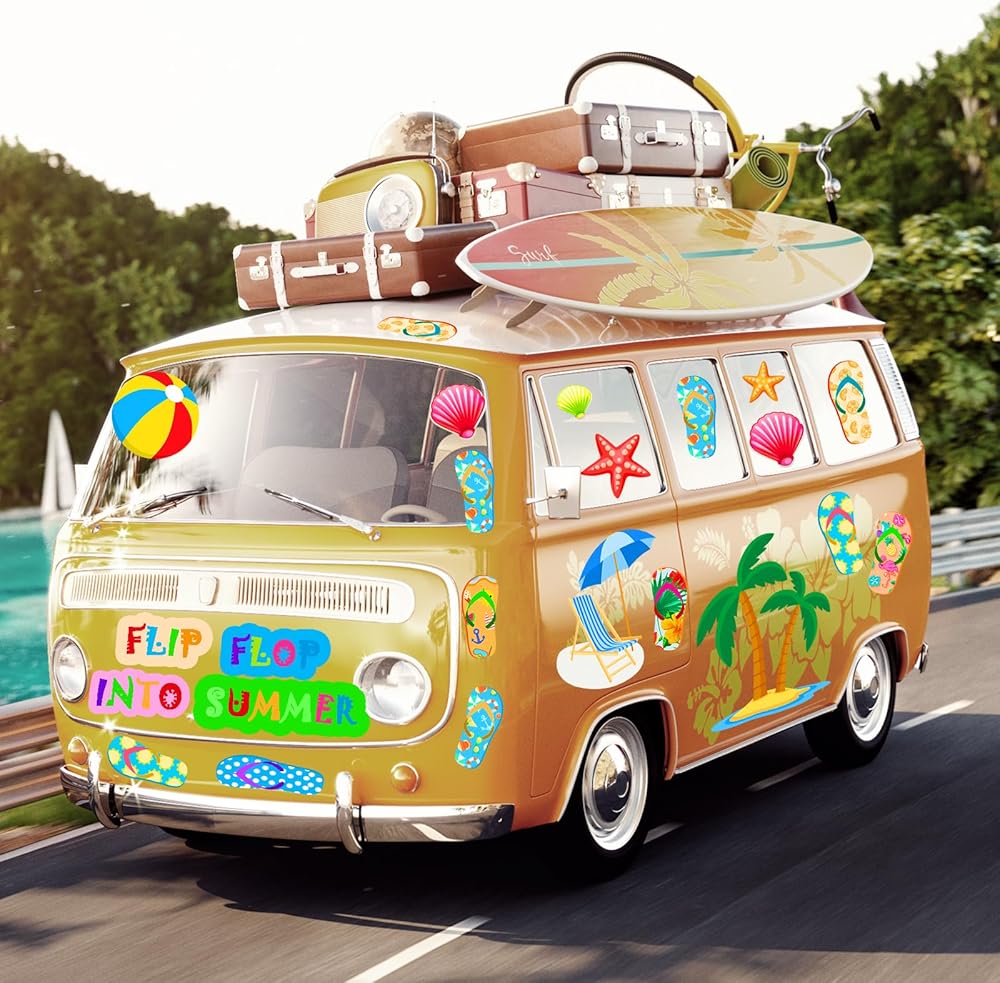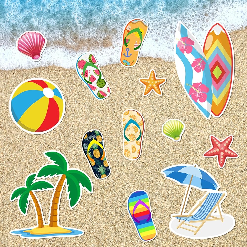 🏖🏖【Package Includes】 These Flip Flops - themed bulletin board borders decoration set include 48pcs flip flops in 12 style, 1pc Beach lounge chair, 1pc surfboard, 1pc coconut tree, 1pc volleyball, 6pcs Starfish in 3 size, 2pcs shells in 2 size and 16pcs ocean waves bulletin board borders, abundant quantity for pool beach Hawaiian themed bulletin board , wall or chalkboard decoration.