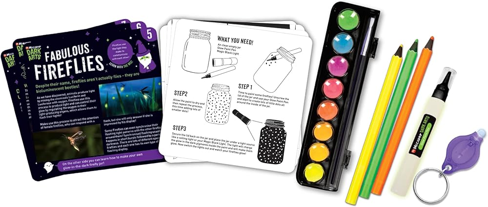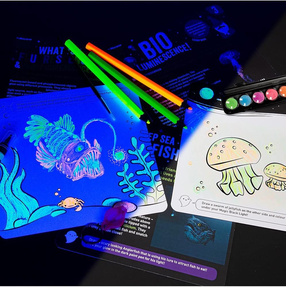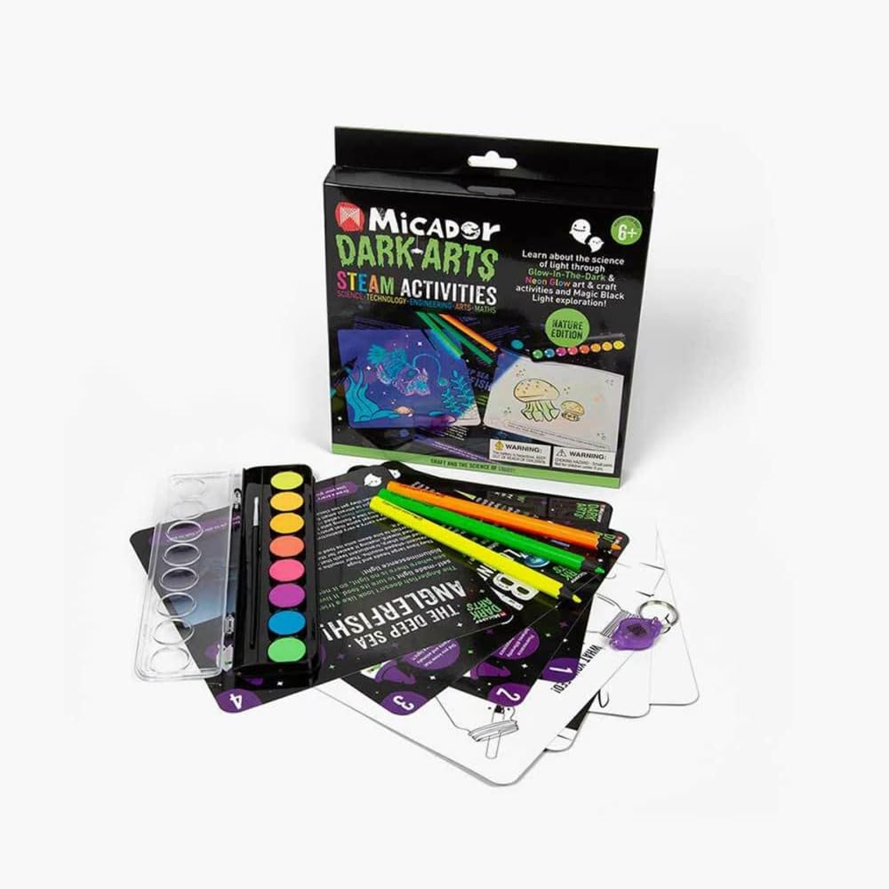 Micador Dark Arts Glow STEAM Activity Packs, Nature - Science of Light - Neon Color Pencils, Watercolor, Glow-in-The-Dark Paint Pen + mini Black Light - Ages 6+