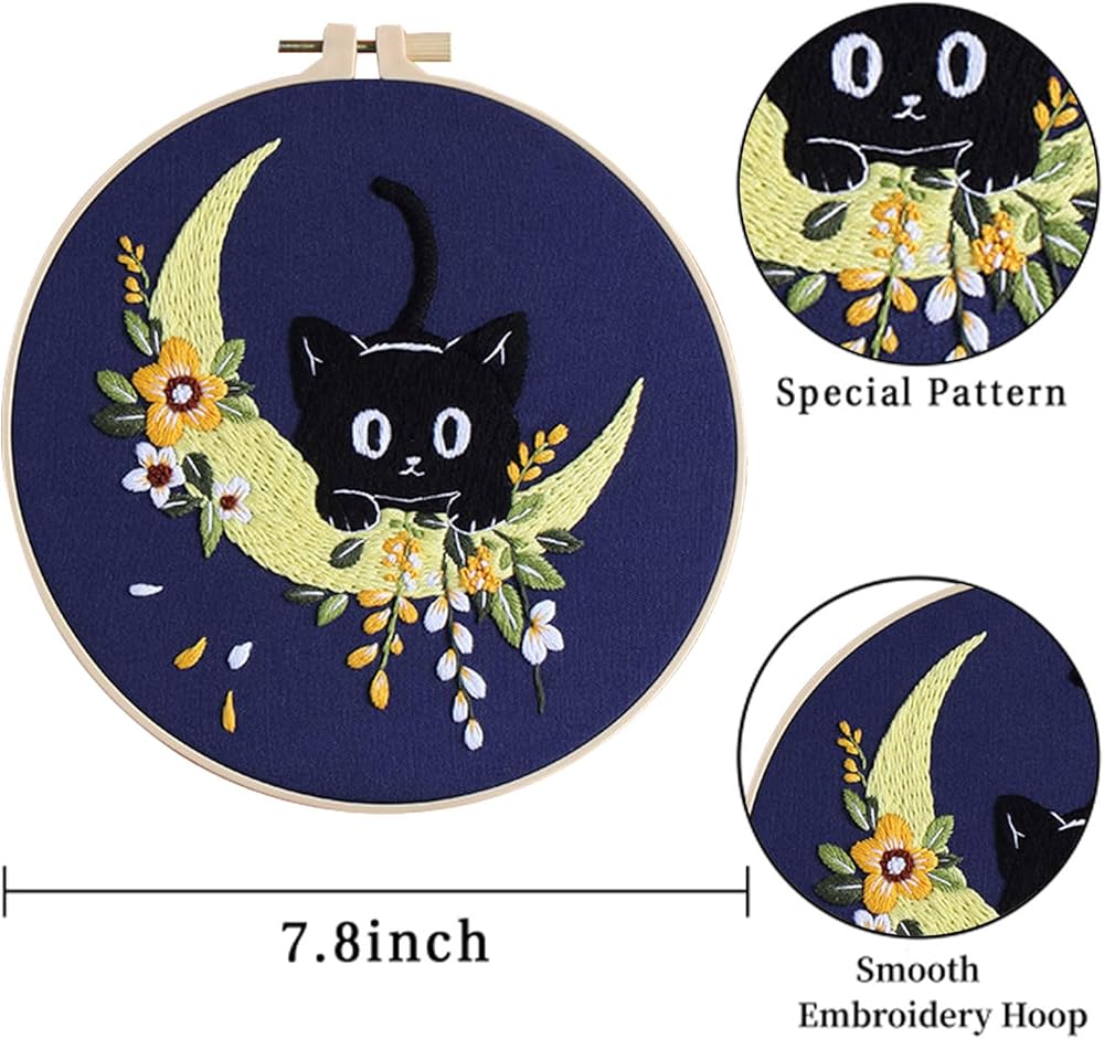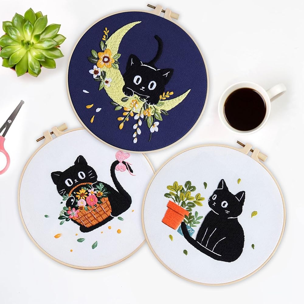 COMPLETE KIT: Includes 3 adorable black cat patterns,1 embroidery hoop, color-coded threads, needles, scissors, and detailed instruction guide for beginners