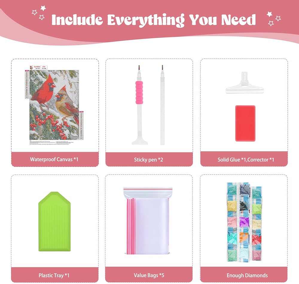 Contain All Tools - Diamond art painting kits contain all tools:1 high definition canvas,1 diamond tray,1 big wax,2 diamond pens,1 replaceable correction pen,5 ziplock bags and enought round diamonds, so you don't need to purchase any additional tools