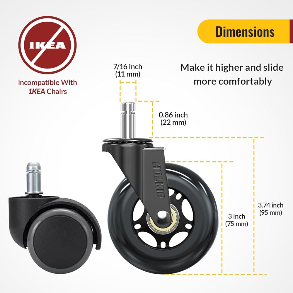 STEM SIZE AND WARRANTY: Stem size with 7/16" (11mm) diameter x 7/8" (22mm) length, fits for most chairs EXCEPT FOR 1KEA. 1 year warranty, free replacement. Please do not hesitate to contact us if you need any assistance.