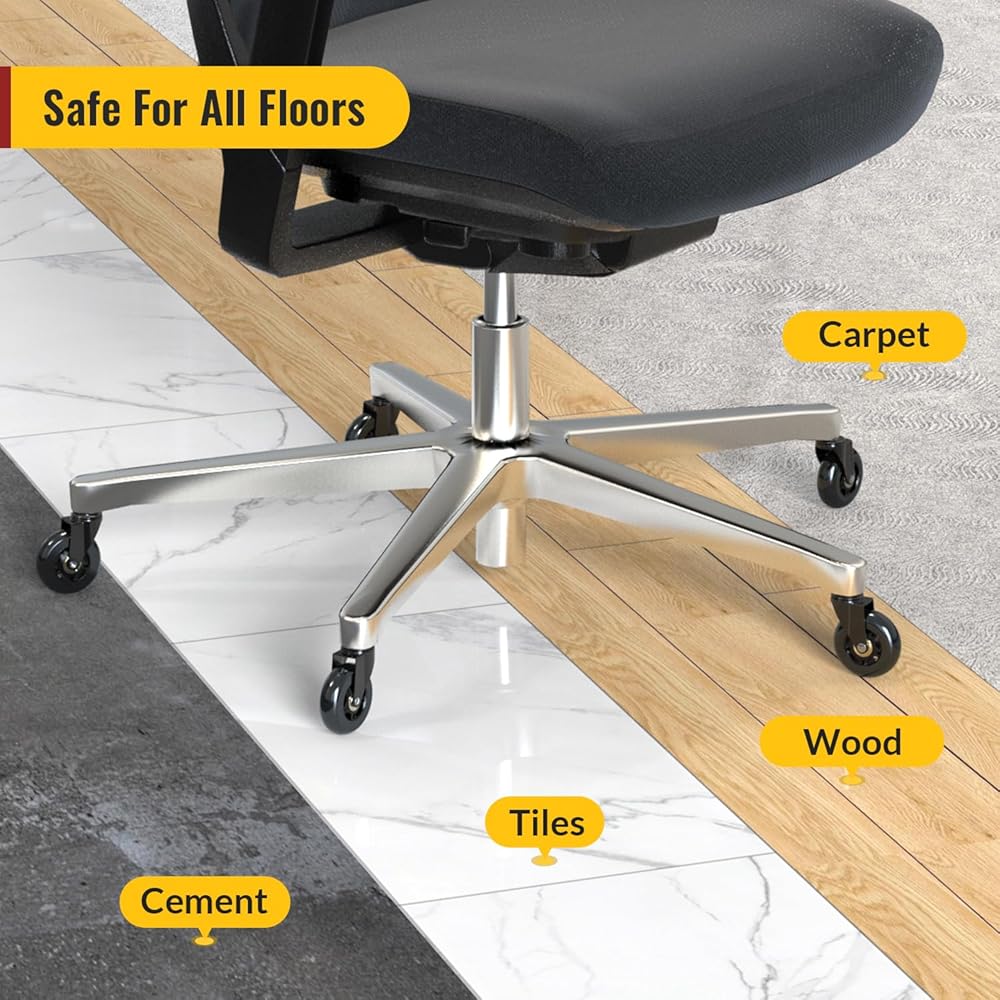 SAFE FOR ALL FLOORS: Covered with a high quality, extra thick, non-marking soft polyurethane layer office chair rollerblade wheels are avoiding to scratch or leave marks on any surface (including hardwood, carpet, tile, laminate and more).