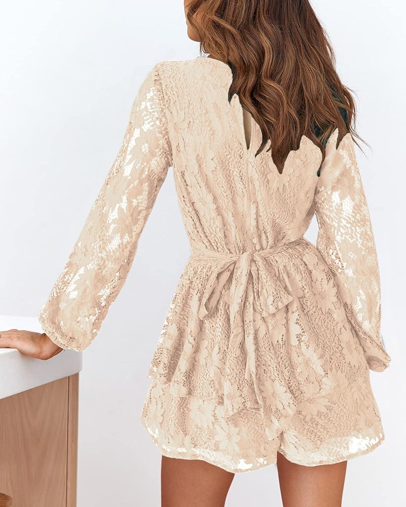 ❀FEATURES:Womens rompers and jumpsuits features with v-neck, tie waist, tiered ruffle hem, mesh sheer see through,short romper dress,flowy embroidery lace flower design. Fall rompers for women 2023/lace rompers for women sexy/long sleeve jumpsuit/v neck jumpsuits for women dressy/one piece short jumpsuit for women/cute fall outfits/sexy dresses for women date night/easter dress for women/womens rompers for fall.