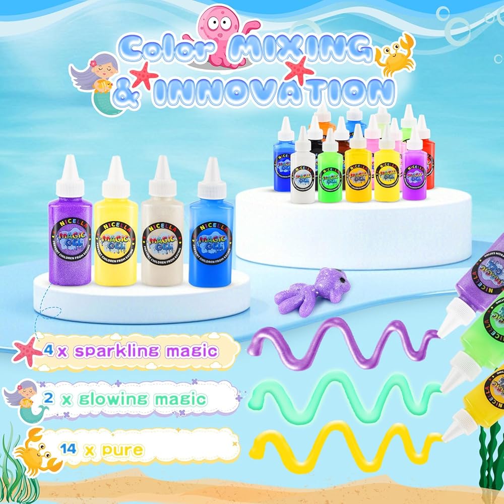 🧼 【Safe and Easy to Use】This aqua fairy water gel kit is environmentally friendly and non-toxic, ensuring that children can enjoy DIY fun with peace of mind. The colorful bottles are soft enough for little hands to squeeze. The edges of the molds are smooth. The magic gel is made from a substance extracted from natural seaweed, and the magic powder is food-grade calcium lactate. All materials have passed rigorous testing in international laboratories. The aqua jelly gel kit also comes with disposable gloves and a storage box, minimizing clutter and facilitating organization.