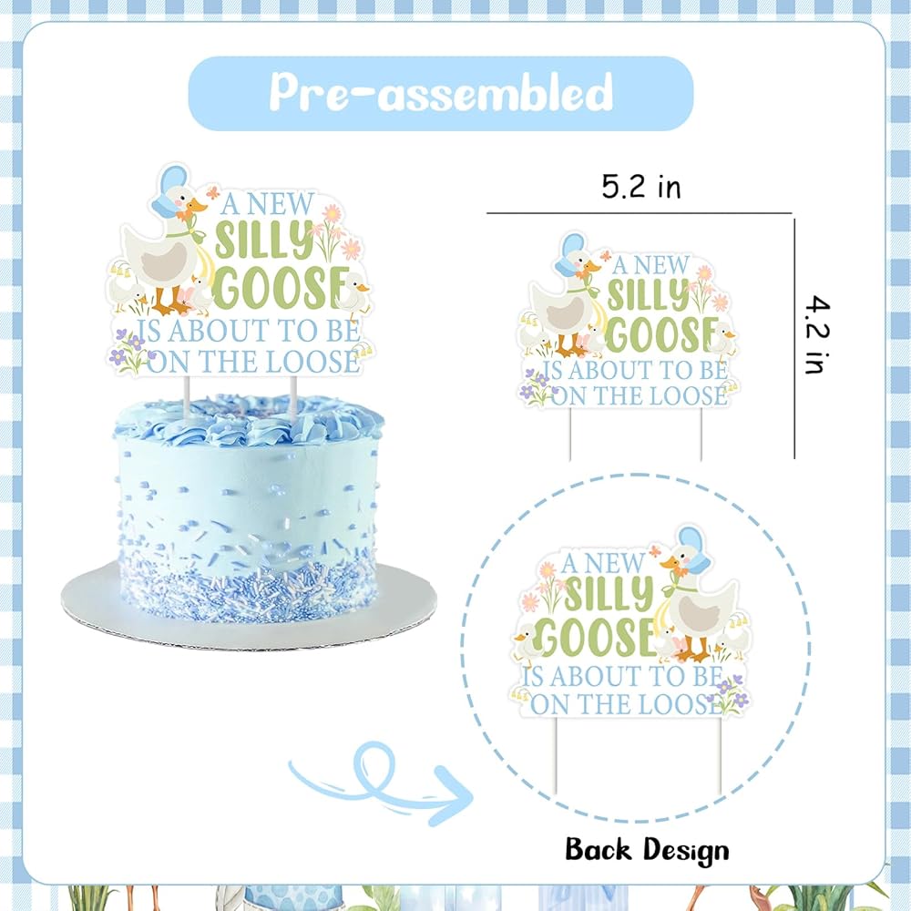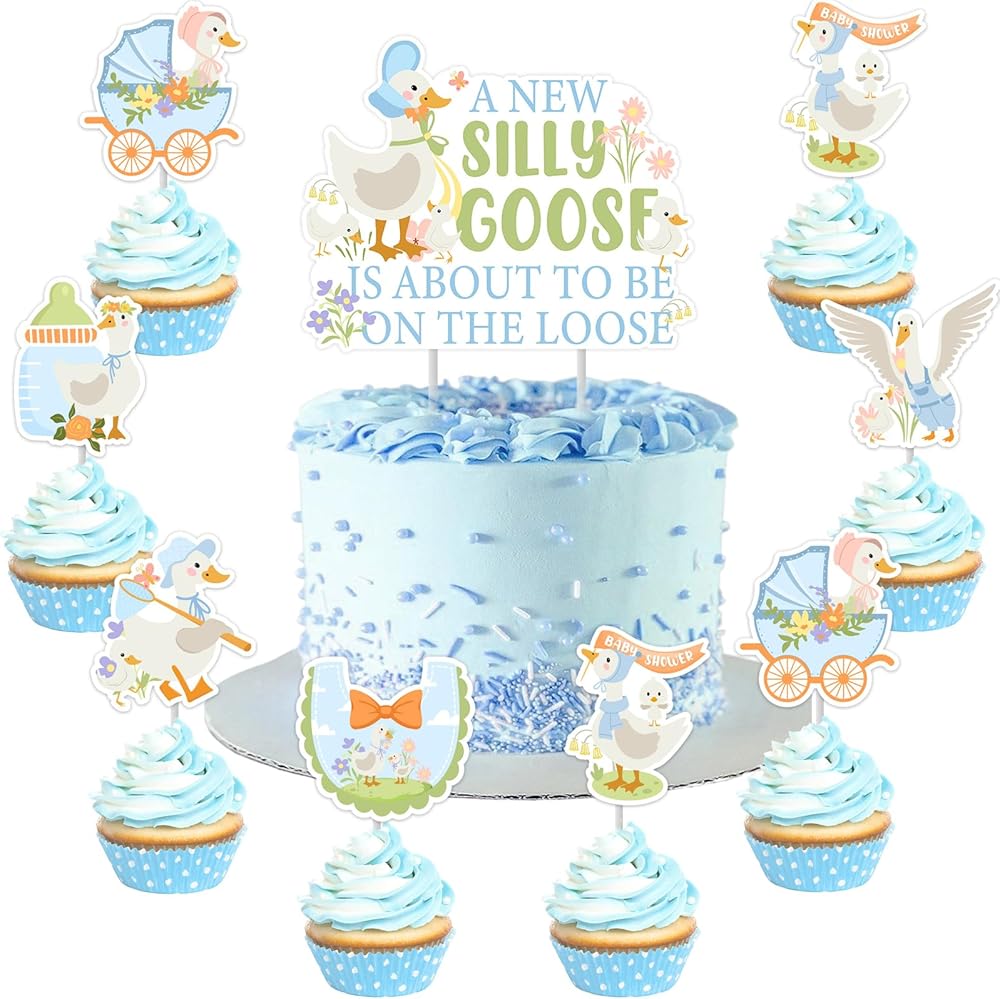 Silly Goose Cupcake Toppers Goose Cake Toppers 25pcs Blue A New Silly Goose Is About To Be On The Loose Cake Topper Set Floral Farm Animal Baby Shower Cake Decor for Geese Flower Gender Reveal Party