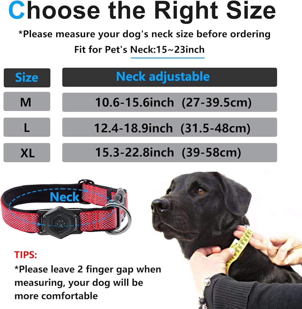 【Wide Range of Sizes】Three sizes of airtag dog collars are available for medium-sized dogs, heavy-duty large dogs, Width:1.18inch, M (10.6-15.6 inches), L (12.4-18.9 inches), XL (15.3-22.8 inches). A non-slip adjustable ring makes it simple to change sizes. Please measure the circumference of your dog's neck before purchasing.