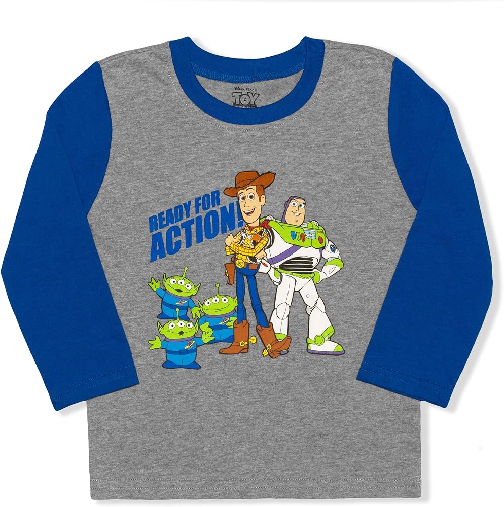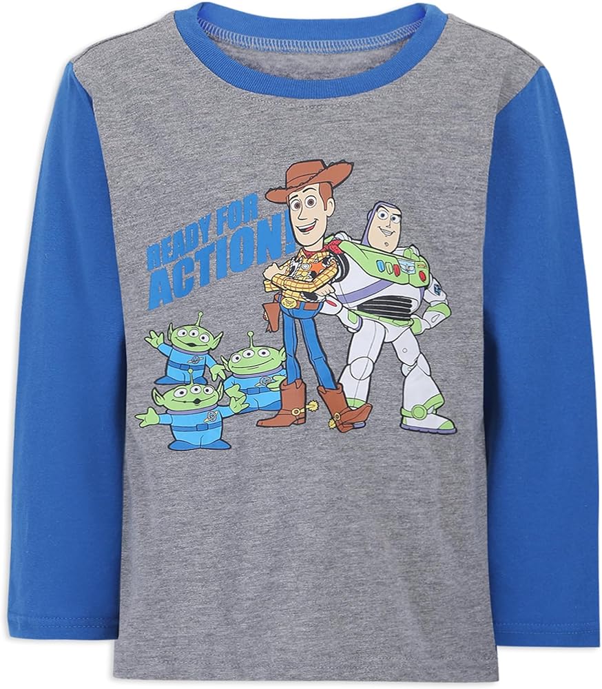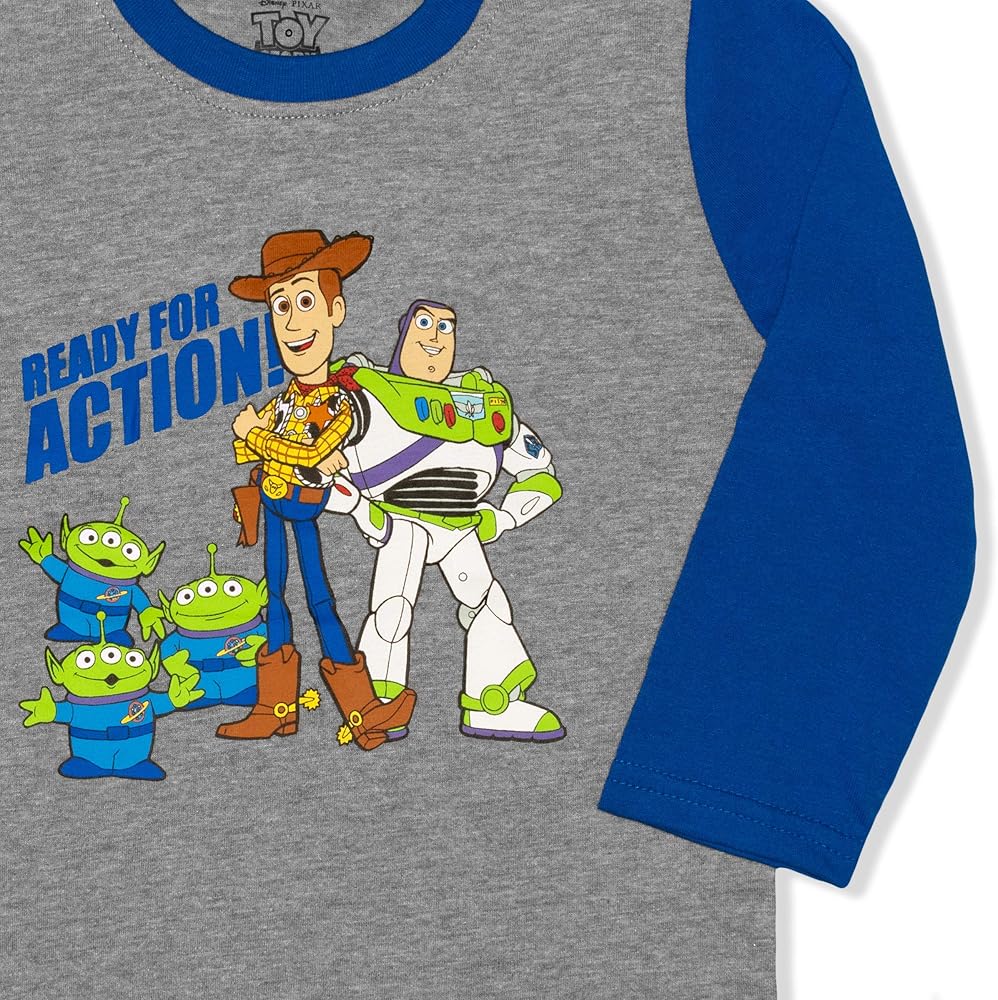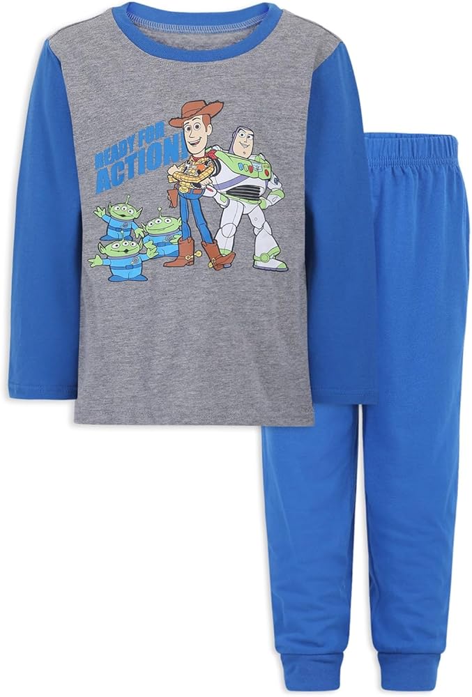 Contains One Cool Blue Buzz Lightyear, Woody, Rex, Forky, Aliens and Hamm “Toys at Play” Long Sleeve Shirt and One Matching Navy Buzz Lightyear, Woody and Forky Print Sweatpants or One Cool Grey Buzz Lightyear, Woody and Aliens “Ready For Action” Long Sleeve Shirt and One Matching Blue Sweatpants
