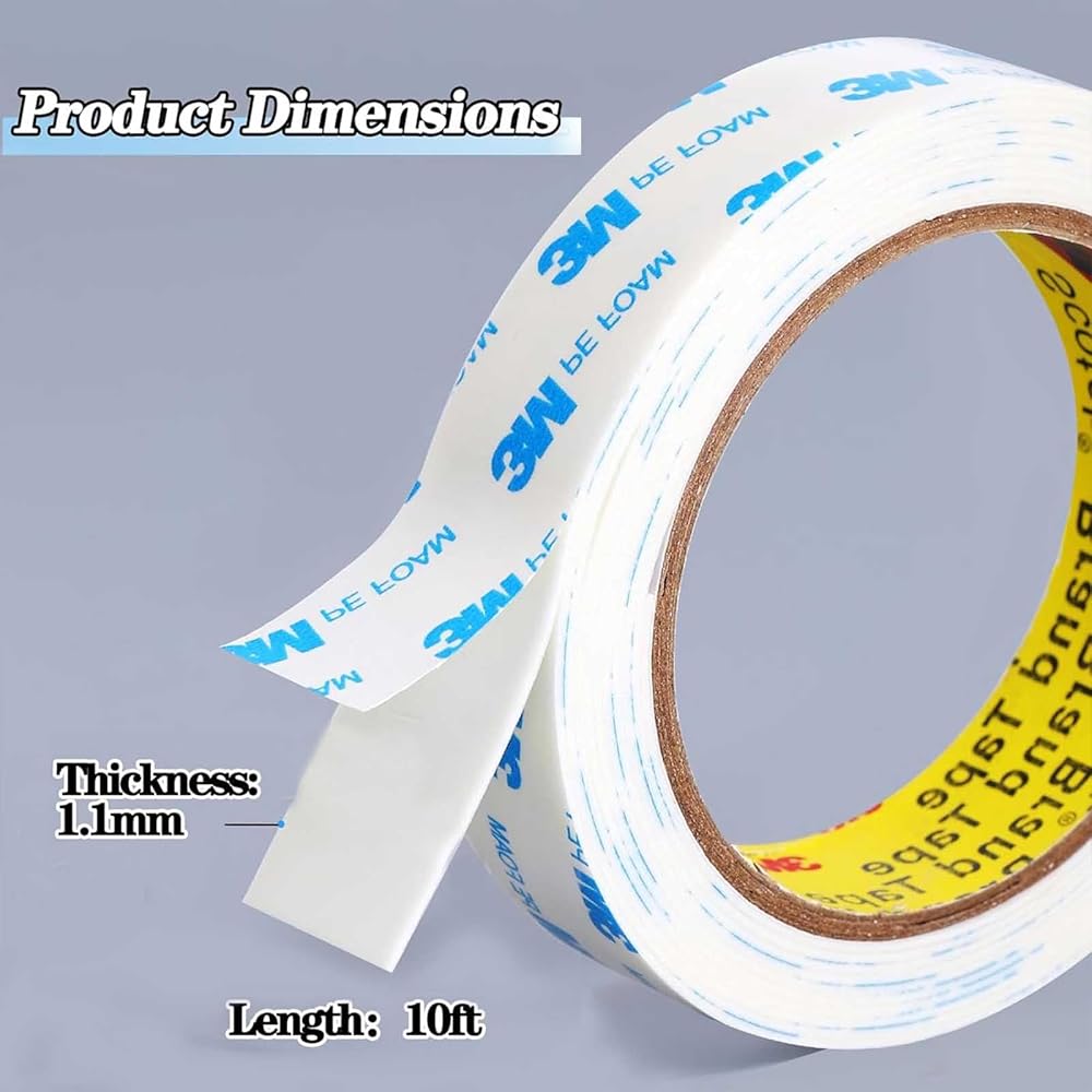 DOUBLE SIDED TAPE: Strong double sided tape, made of PE foam material, is 0.5in/12.5mm in width, and 10ft/3m in length, with a thickness of 0.043in/1.1mm. It can hold up to 4.4 pounds per square inch and is resistant to temperature and waterproof, while also offering cushioning and shock-absorbing properties.