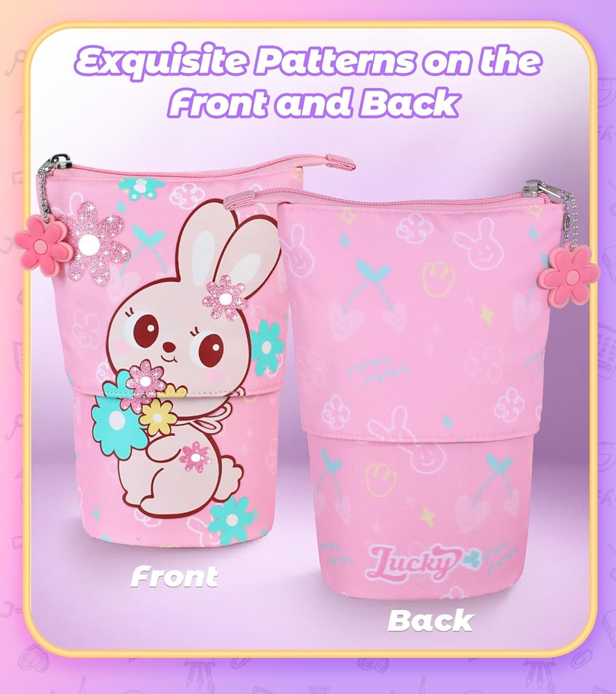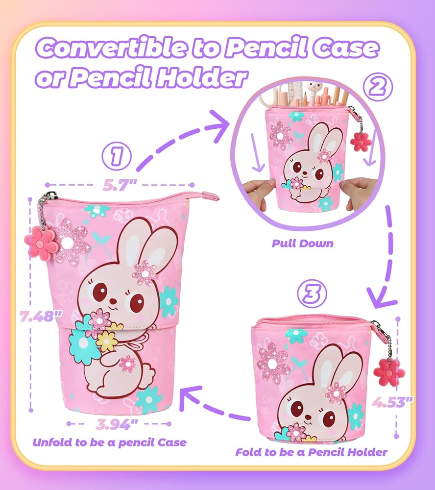 Standing Pencil Case for Kids - Back to School Stuff, Cute Bunny Telescopic Zipper Pencil Case Aesthetic, Large Capacity Stand up Pen Bag, Portable Pen Holder, Study Supplies for Students