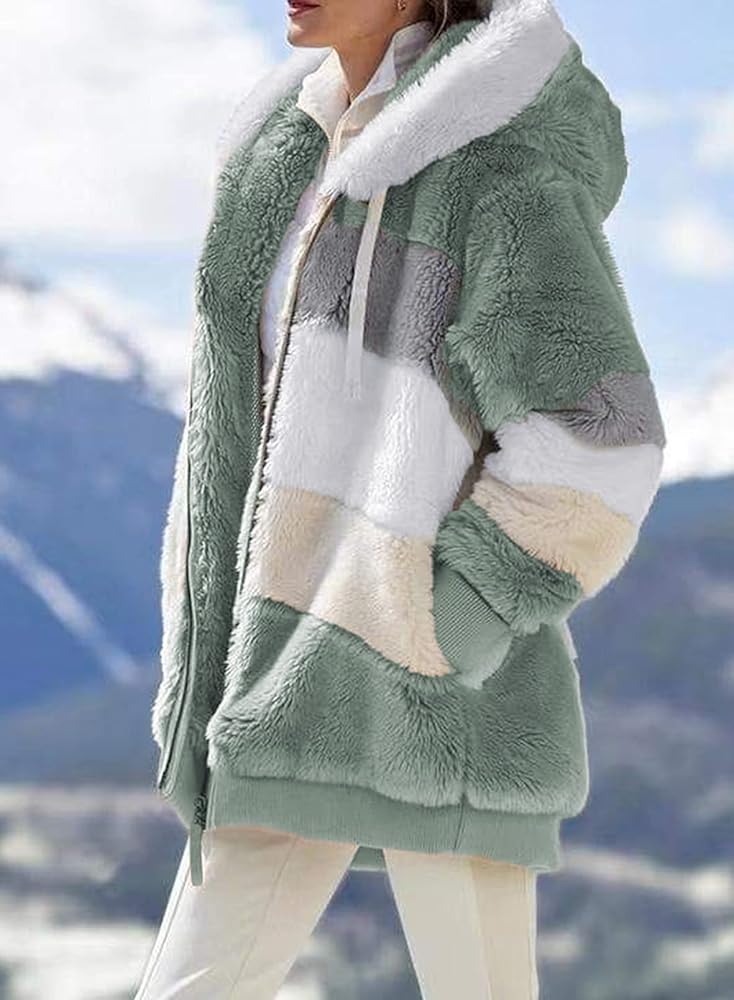 The women casual jacket coat features hooded,front zipper,soft and comfy fleece material,fashion Color Block Patchwork,two side pockets,oversized style can fit more body for ladies.