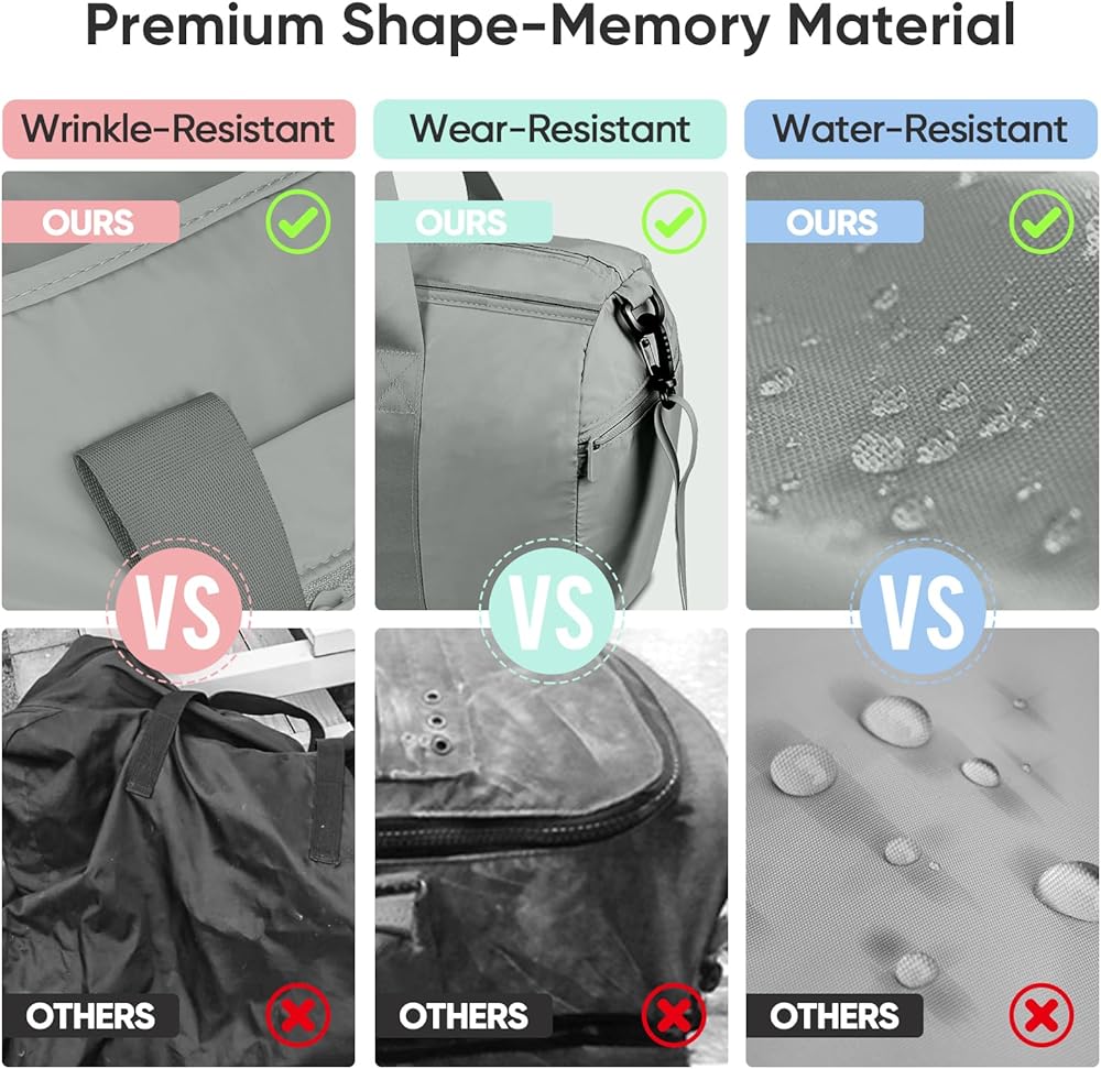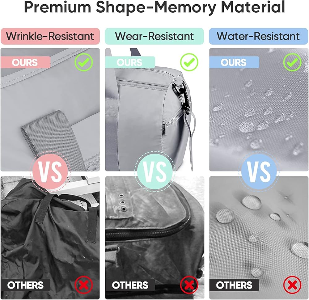 [LIGHTWEIGHT & WATER PROOF DUFFLE BAG] Our duffle bags are made with 294T Twill Fabric. They are soft, washable, waterproof, wrinkle-free, and wear-resistant. Waterproof exterior keeps your clothes and items dry; it can be used both indoor and outdoor. Duffelbag with handles, and removable shoulder strap with adjustable buckle.