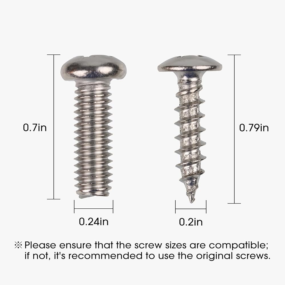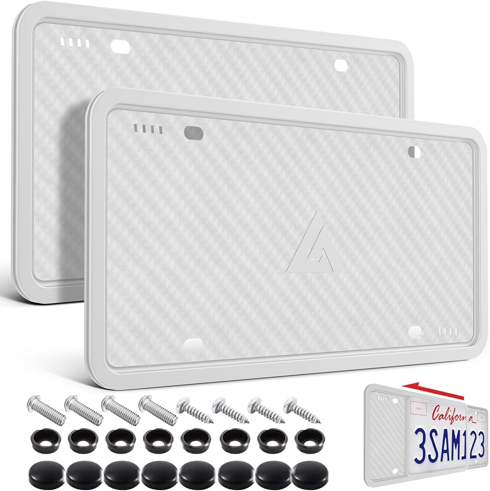 UPGRADED QUICK-INSTALLATION DESIGN: This item comes with 8 screw caps, 8 stainless hex nuts, 4 stainless tapping screws and 4 stainless pan head screws. But screws are not suitable for Tesla. Tesla owners need to purchase Tesla specific screws. Simply slot your plate into the silicone license plate frame and align the plate with the four holes on the frame. Screw the license plate on your car with the hex nuts first, screws second and screw caps finally.