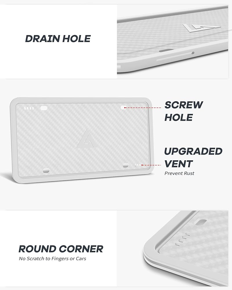 FASHIONABLE DESIGN & HUMANIZED DETAILS: This silicone license plate frame has 4 reinforced round corners, looking great on your vehicle while averting damages caused by traditional sharp-cornered frames. In addition, along with the 2 drain holes on the bottom, the upgraded vents on the upper left corner and lower right corner keep your license plate away from water accumulation and rust.