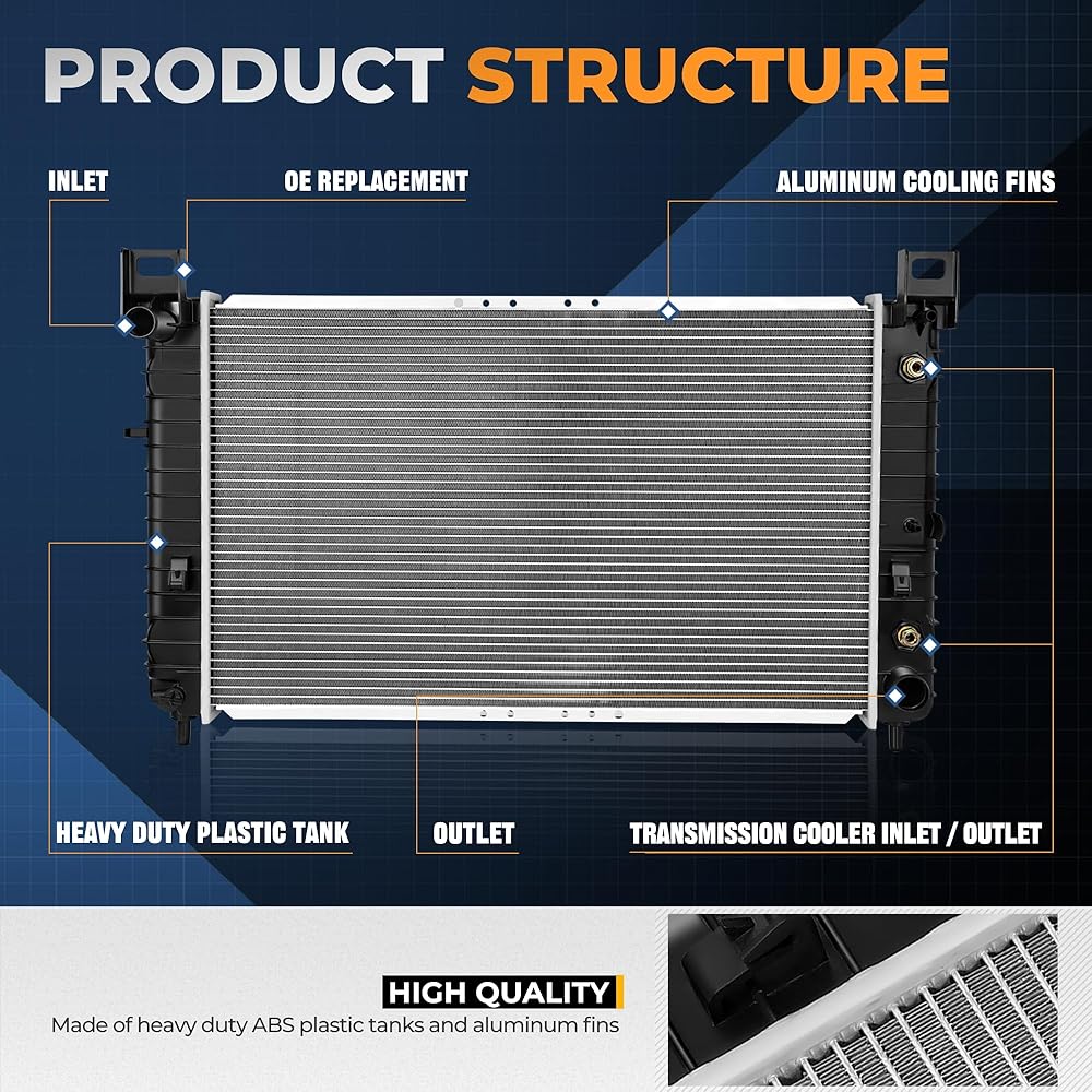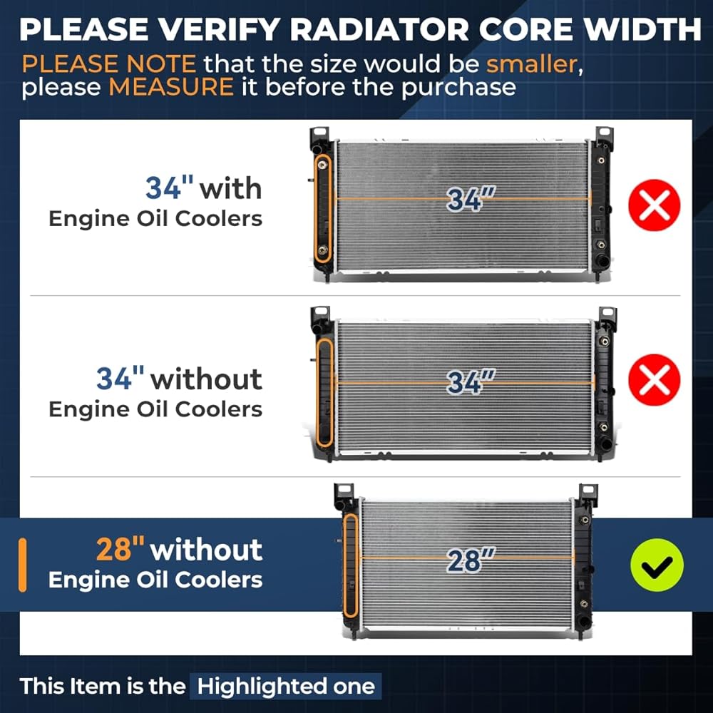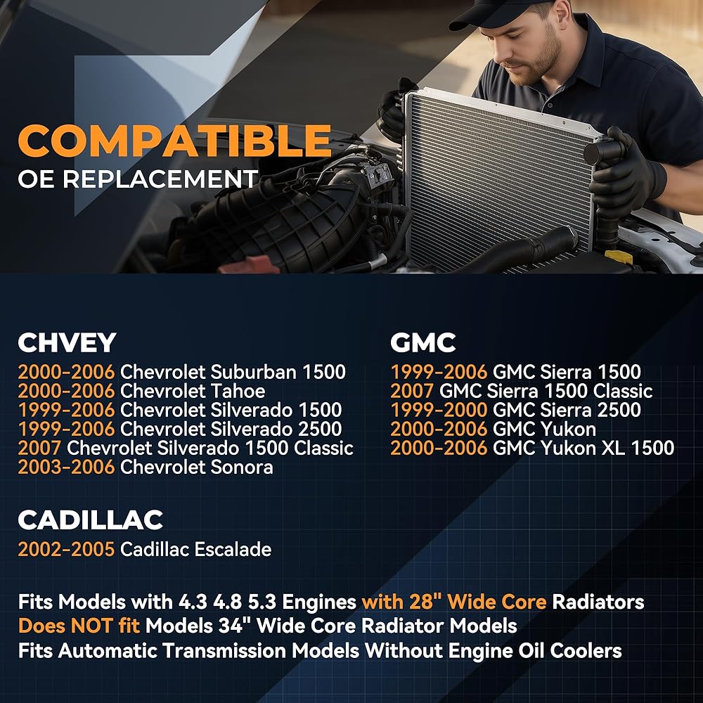 Vehicle Compatibility: (Please NOTE that the size would be smaller, please MEASURE it before the purchase) Brand new radiator Compatible with Chevy Silverado 1999-2006, Silverado 1500 Classic 2007, Sonora 2003-2006, Suburban 1500 Tahoe 2000-2006, Cadillac Escalade 2002-2005, fits 4.3L 4.8L 5.3L engines models with 28 wide core radiators and automatic transmission