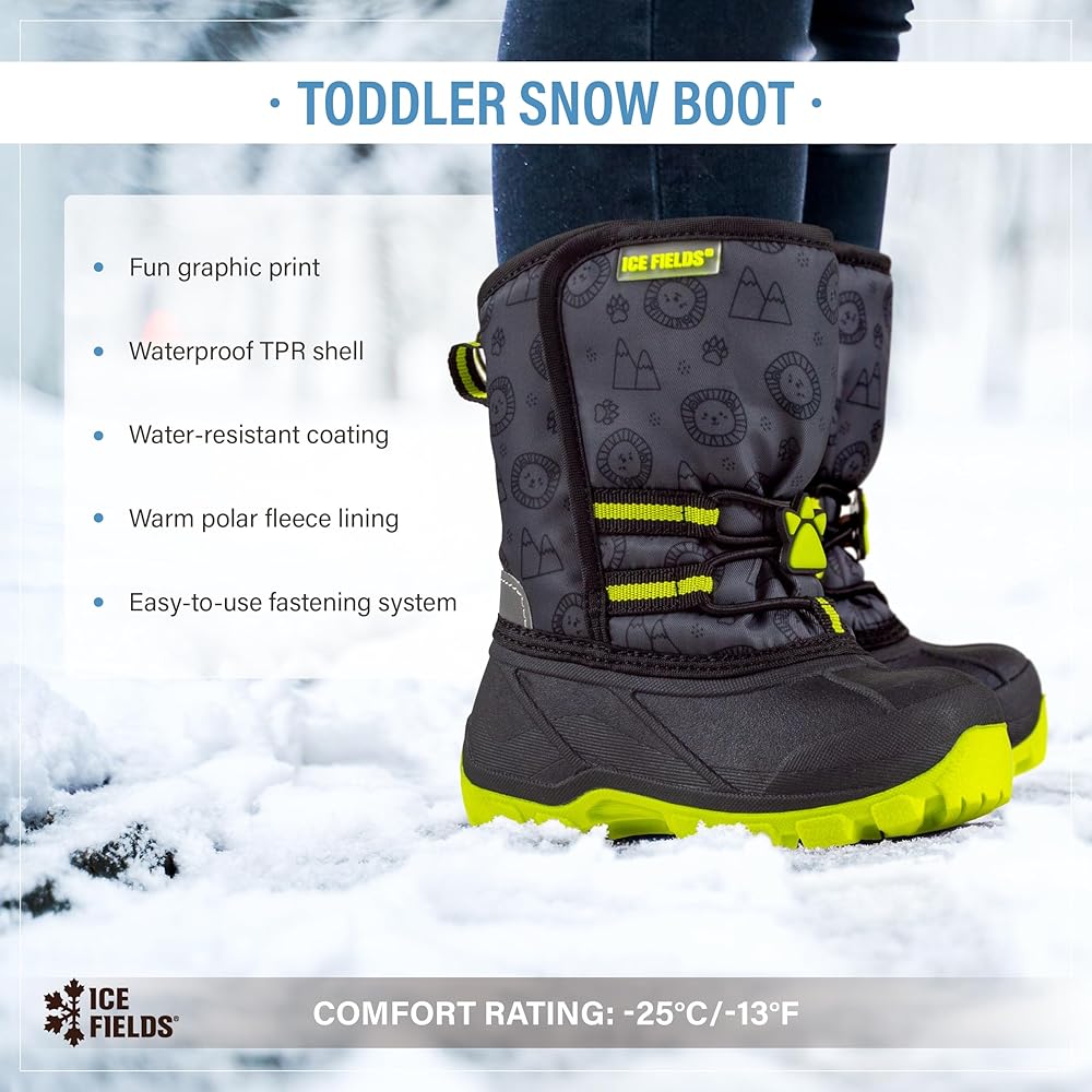 DURABLE PERFORMANCE: The polyester upper with a fun graphic print and PVC graphic tab ensures durability and adds a playful touch to your child's winter wardrobe; These toddler winter boots are designed to withstand active play in rough weather conditions
