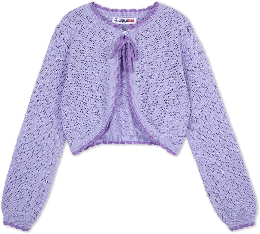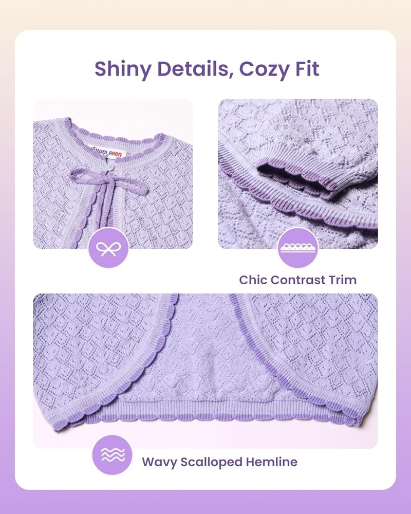 【WELAKEN - I am special】 This lightweight knit shrug is a perfect blend of cozy comfort and sweet design. With its soft texture, heart-shaped knit details, and ruffled edges, it adds a touch of playful elegance to any little girls outfit