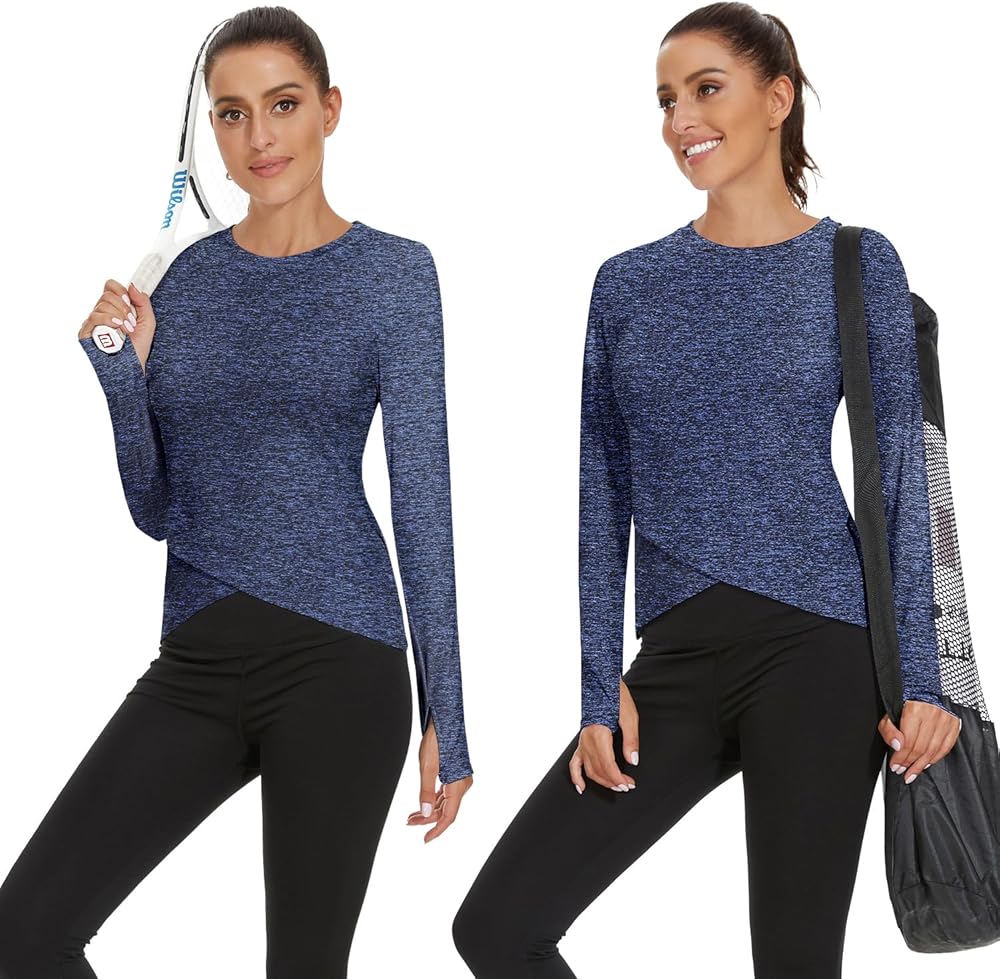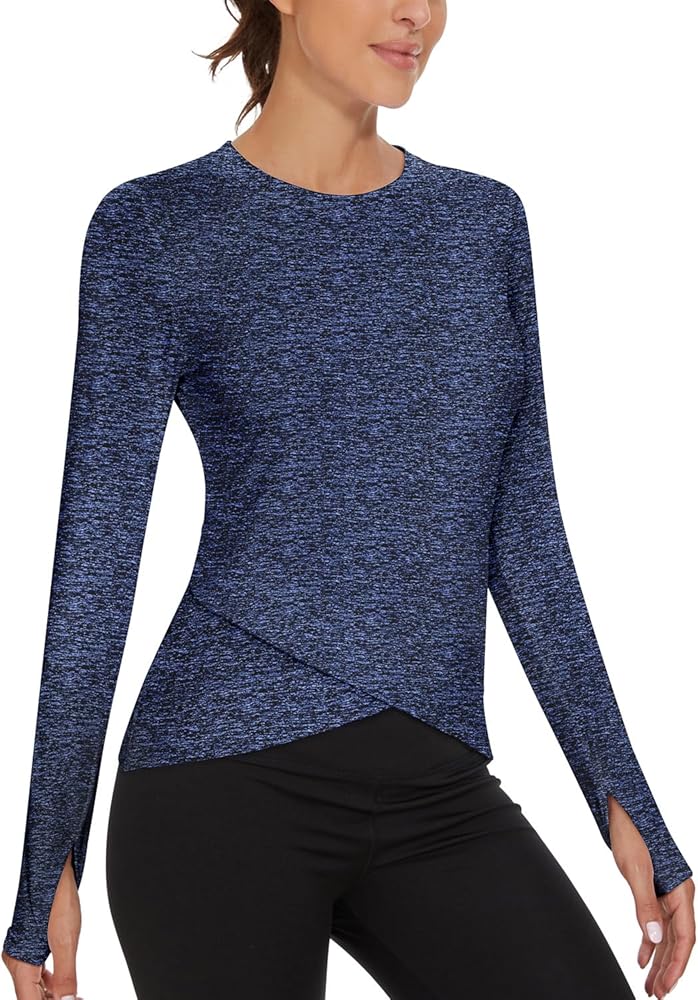 【Yoga Shirts Cross Hem Deign】Long sleeve compression shirts with thumbholes with crossed Hem design adds a fashion element to the warm running shirts. The design of the splice piece can trim the side of the body and make it slimmer.