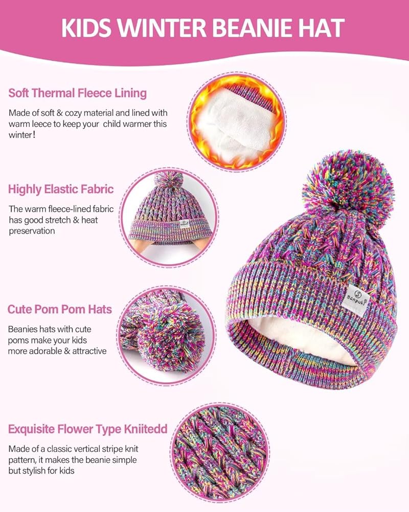 Kids Winter Hat Gloves Scarf Set,Girls Toddler Winter Hat Beanies with Pom Neck Warmer Gaiter Mittens Fleece Lined Set Christmas Gift for Kids(Rainbow Mix)