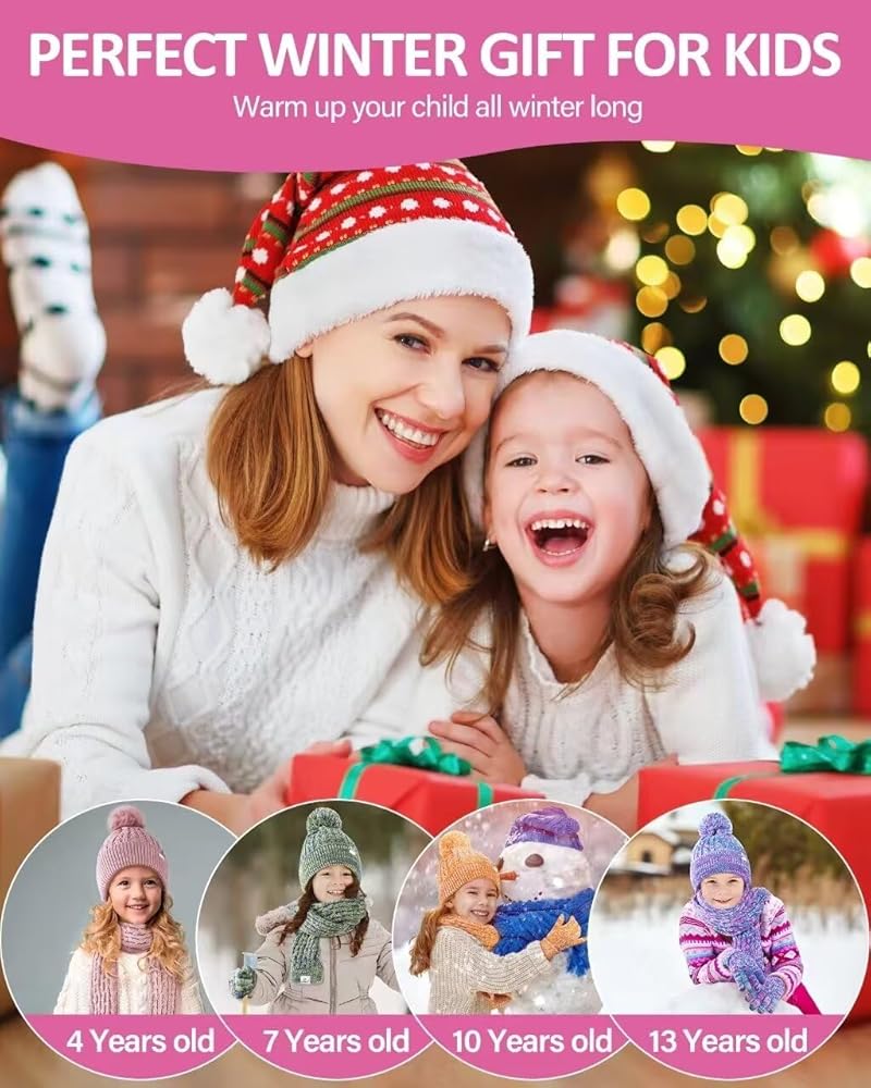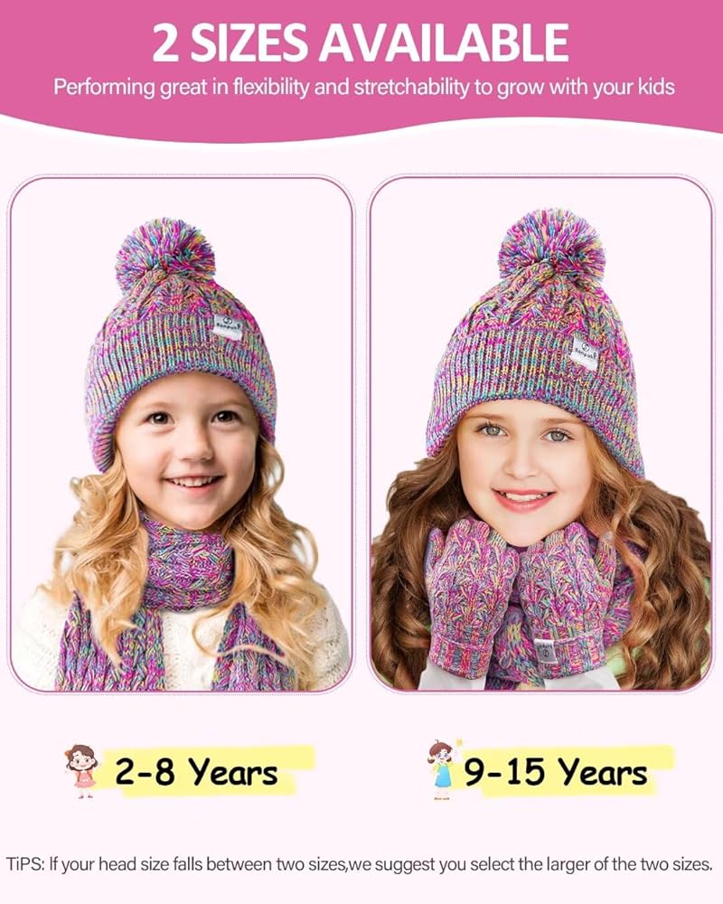 【Pick the Perfect Size】 Our kid's beanie glove scarf set for girls&boys is available in two sizes: small (for ages 2-8) and large (for ages 9-15). The warm fleece-lined fabric is flexible and possesses an impressive heat-retention capacity, making each size suitable for a wide age span.