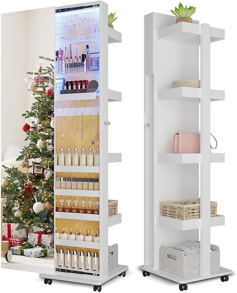 Lvifur 360° Rotating LED Jewelry Armoire,Side Pull Full Length Mirror Large Capacity Floor Standing 3 Color Dimmable Jewelry Organizer Armoire with 4 rollers,Rear Storage Shelves