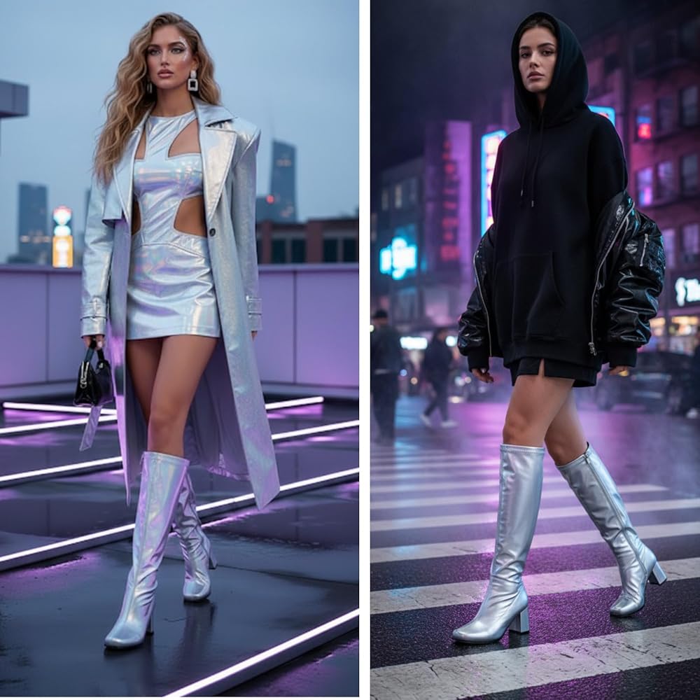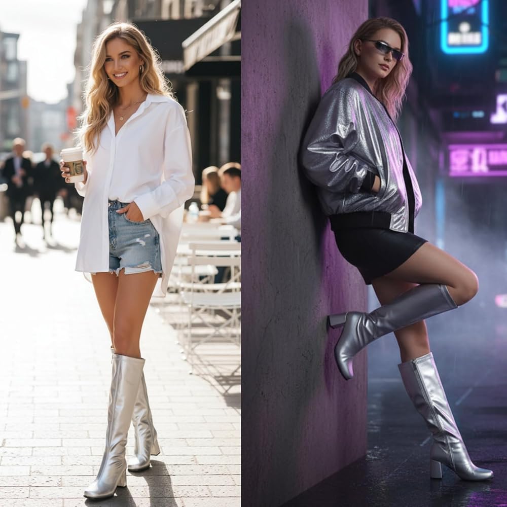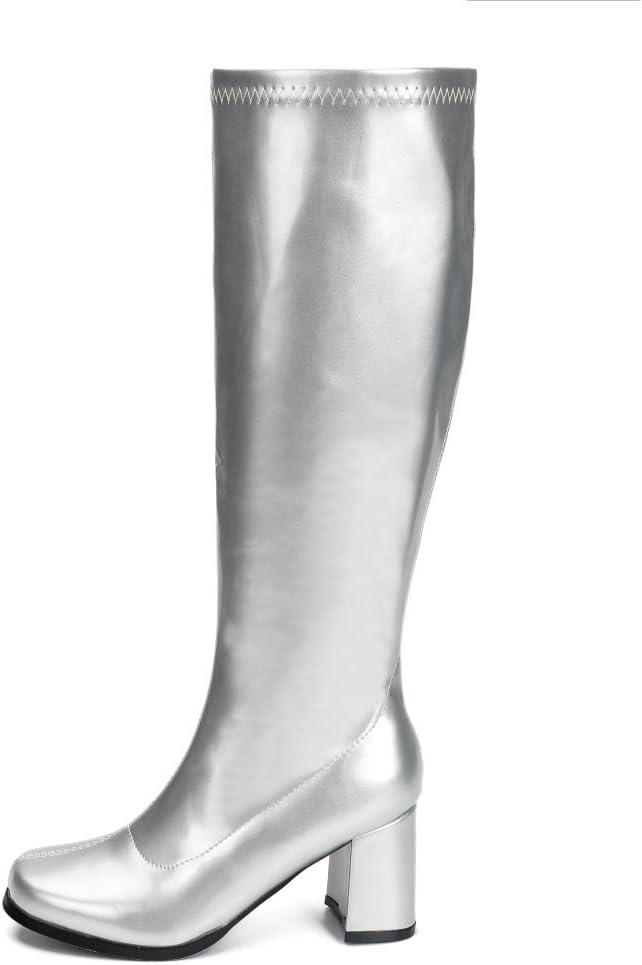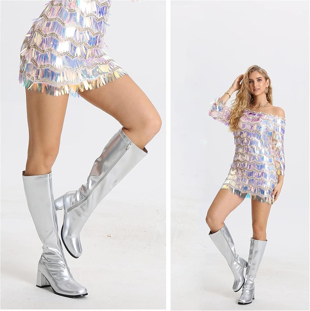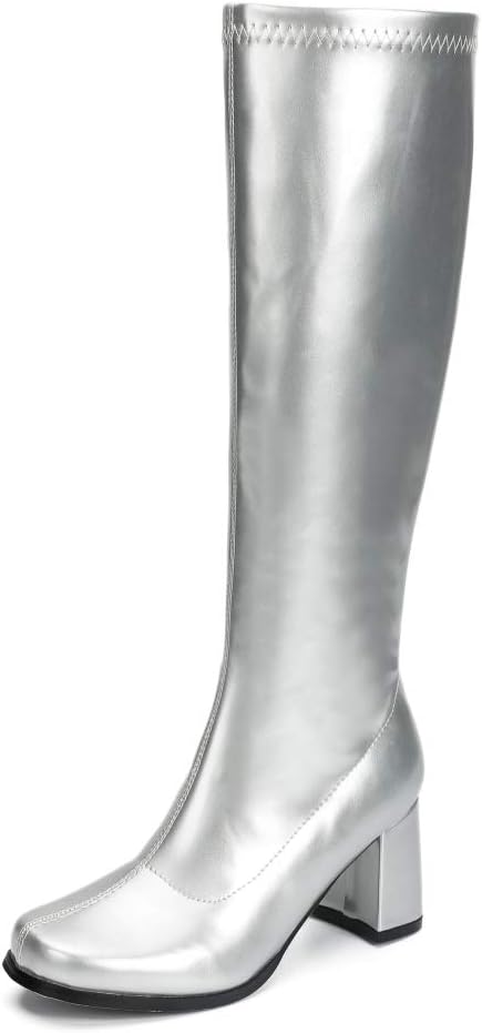 GO GO BOOTS: These high boots have White/ Black/ Pink/ Red/ Silver available, featuring square toe, block chunky heel, built-in zipper for easy switching, comfortable knee high gogo boots.