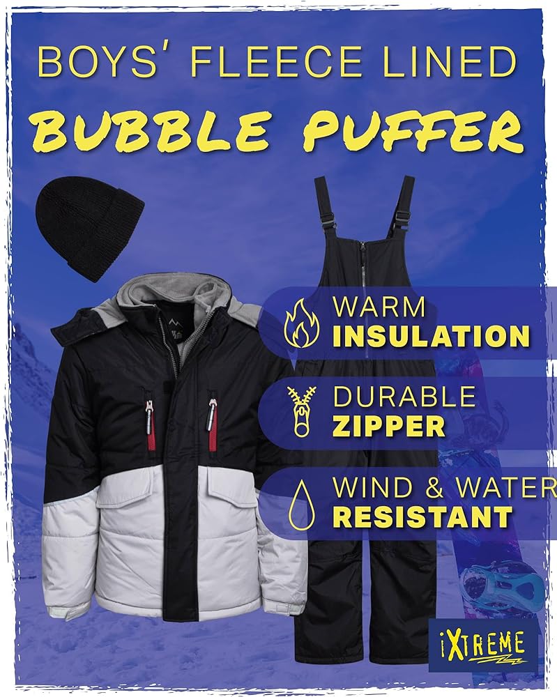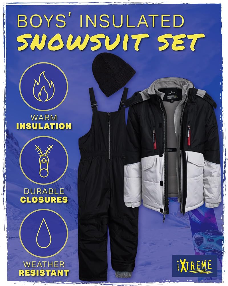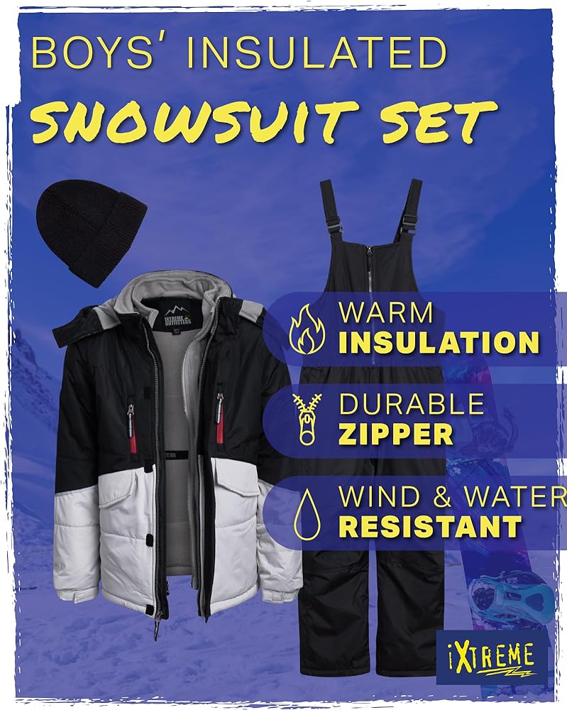 BOYS' SNOWSUIT: This boys' winter snowsuit with ski jacket, snow bib overalls, and beanie hat is the perfect outfit for your son during cold seasons; Our high-quality and skin-friendly snowsuit comes in a variety of colors so you can choose the one that best suits his unique style; Keep your boy safe and comfy in this snug snowsuit