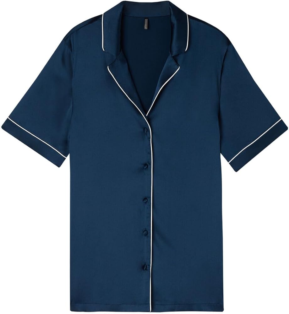 Menswear cut light stretch silk satin short sleeve shirt with trim that is either tone-on-tone or in a contrasting color, depending on the color selected. Elegant and comfortable, it is perfect to create a refined evening outfit, but can also be worn as a outerwear jacket with pants or jeans.