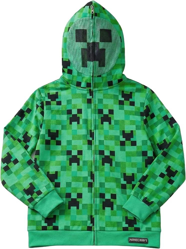 Bring the excitement of Minecraft to life with this cozy and fun Creeper Camo Face Zip-Up Hoodie, made just for little fans of the game! Featuring a bold green design with a camo-style Creeper face on the hood, this hoodie combines comfort, character, and creativity all in one. Made from soft, breathable fleece, it's perfect for layering in cooler weather or wearing on its own during mild days. The full zip-up front makes it easy for kids to dress themselves, while the relaxed fit allows plenty of room for movement—great for gaming marathons, outdoor play, or costume parties. Whether they're pretending to sneak through Minecraft worlds or just showing off their favorite character, this hoodie keeps them warm and ready for adventure. Ideal for boys and girls, this versatile hoodie adds a playful touch to everyday wear, costume fun, or casual outings.
