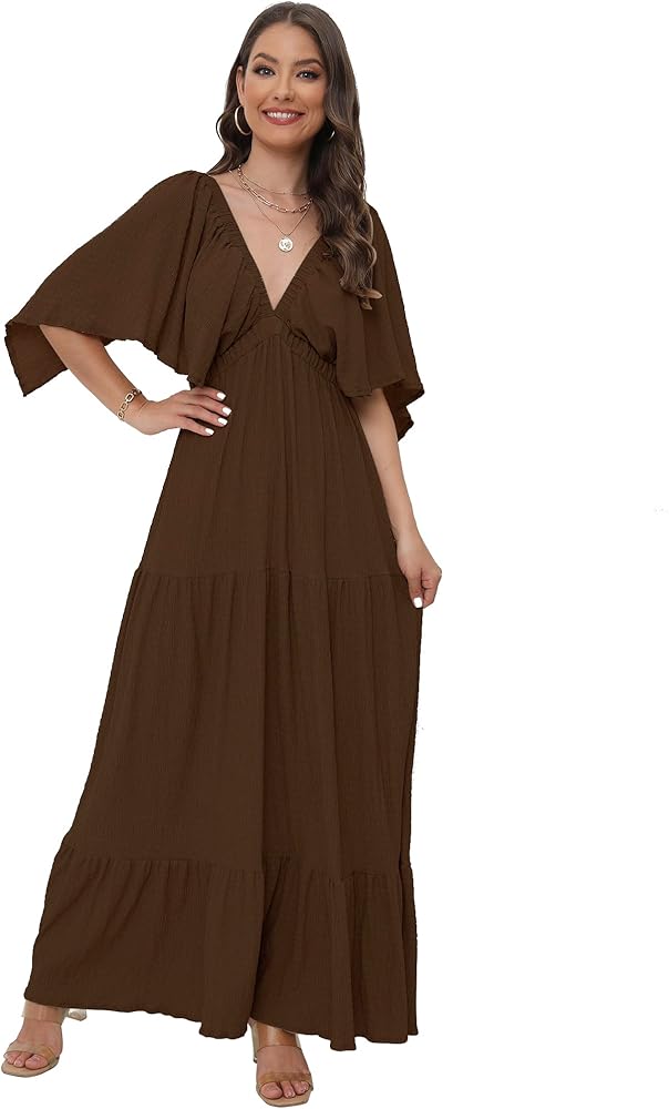 Forever free and flowy, this effortless maxi dress is featured in a V-neck, tiered silhouette with flutter sleeves for added shape