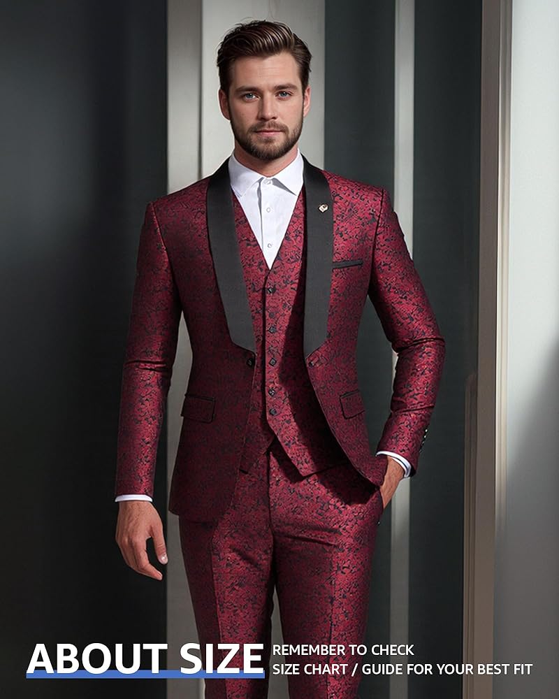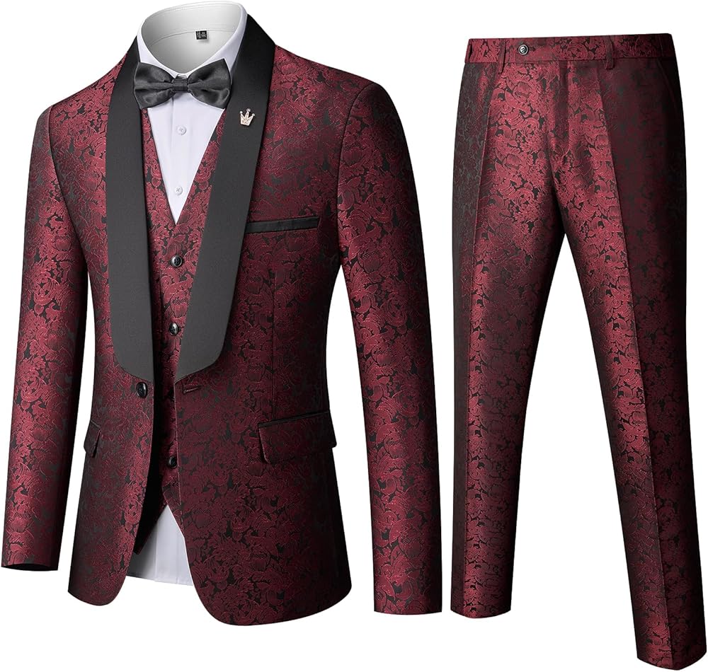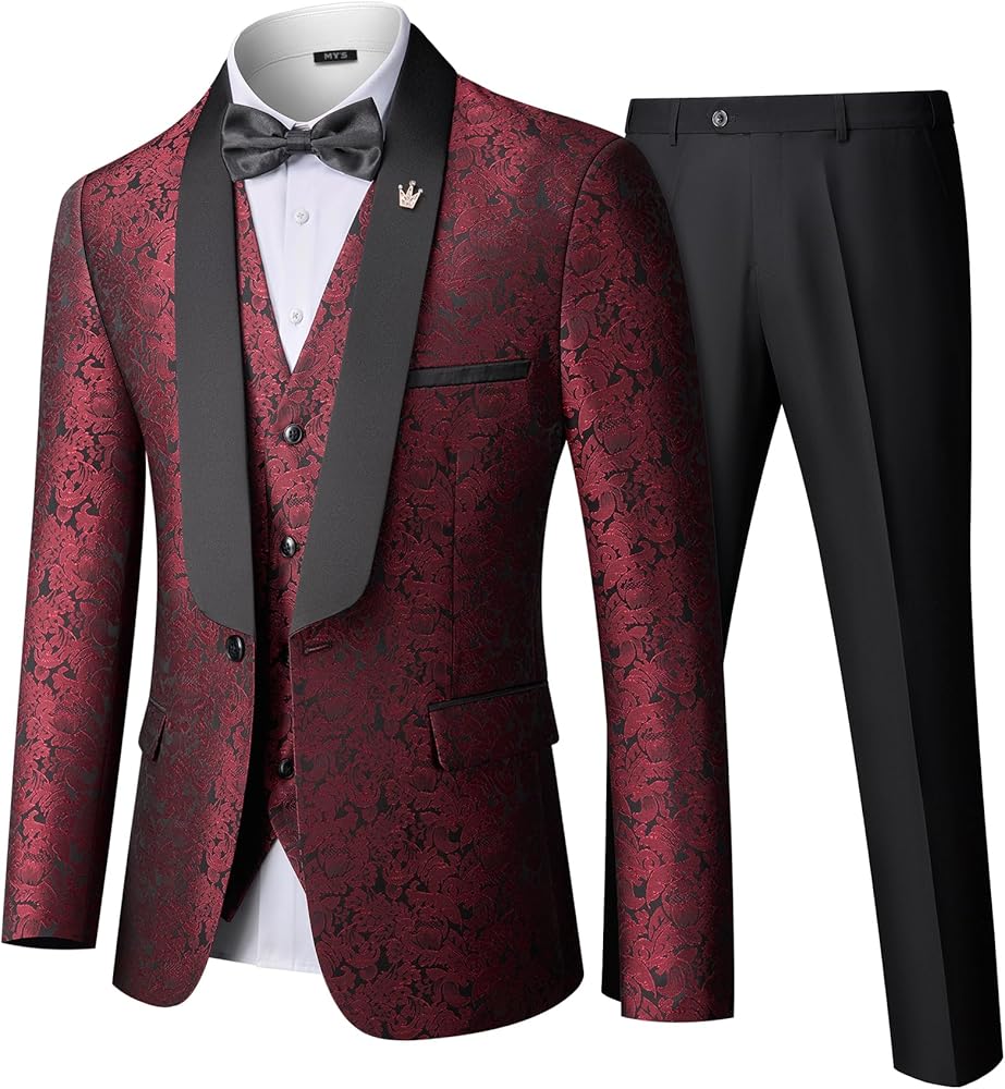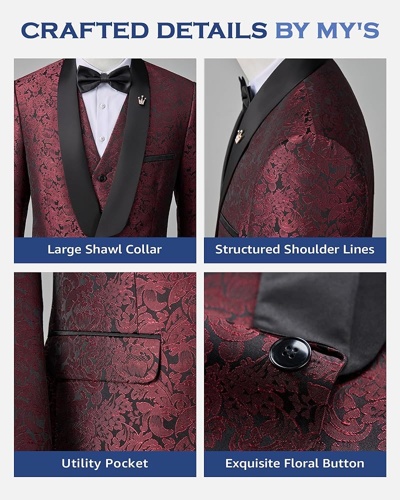 MY'S - MAN YOU'LL SUCCEED: Features a shawl lapel blazer with 1-button closure, 4-button cuffs, and multiple practical pockets. The jacquard floral pattern adds a shiny, unique touch to the jacket and vest. Comes with trousers and a bow tie for a refined look