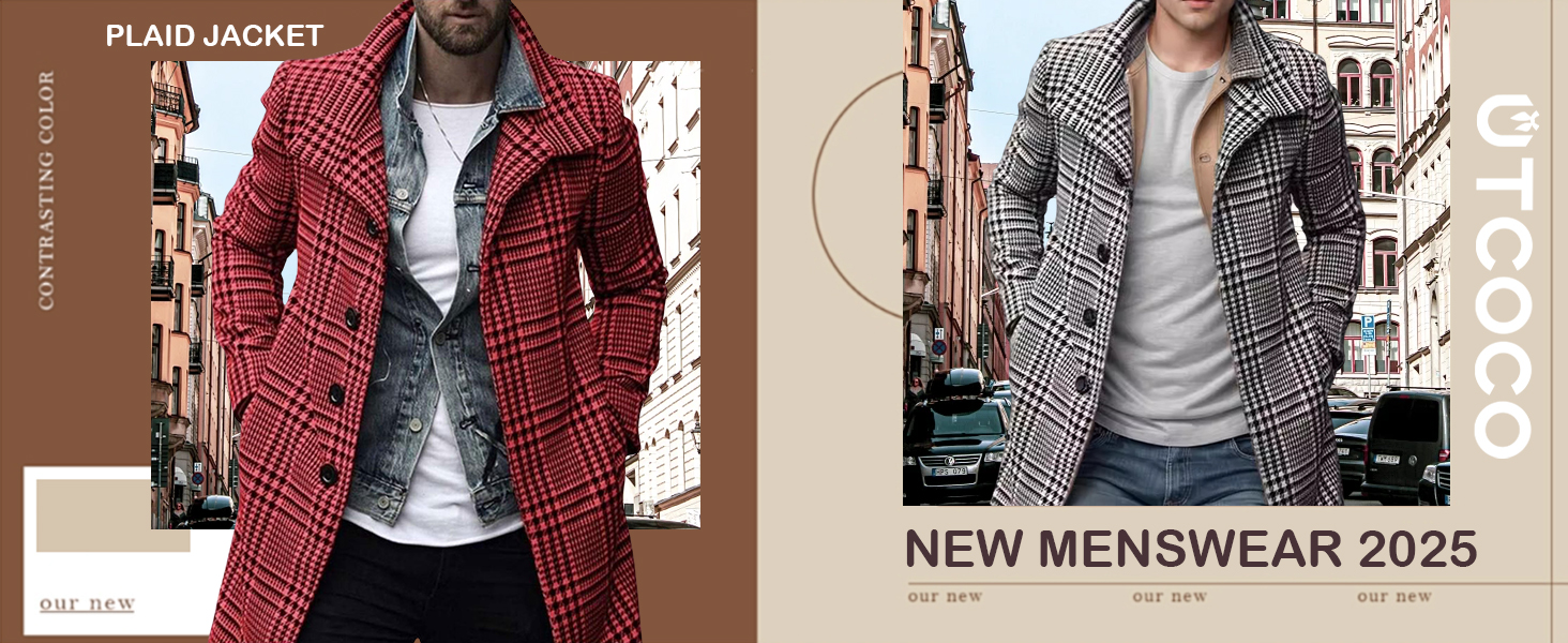 【MATERIAL】utcoco mens Plaid trench coat is made of high-quality fabric; soft, lightweight and comfortable, Black/Red/Green Plaid available.