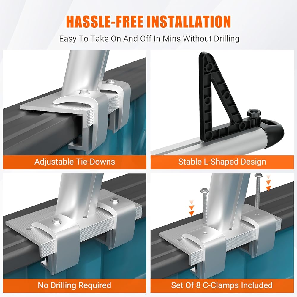Start Loading in No Time: Stop to waste time in installation! Our racks for trucks feature a quick C-clamps(8 pcs) mounting system that requires no drilling. All necessary mounting accessories are also provided. The choice has never been easier. It won't cause damage to your truck side beam, and it can be removed quickly.